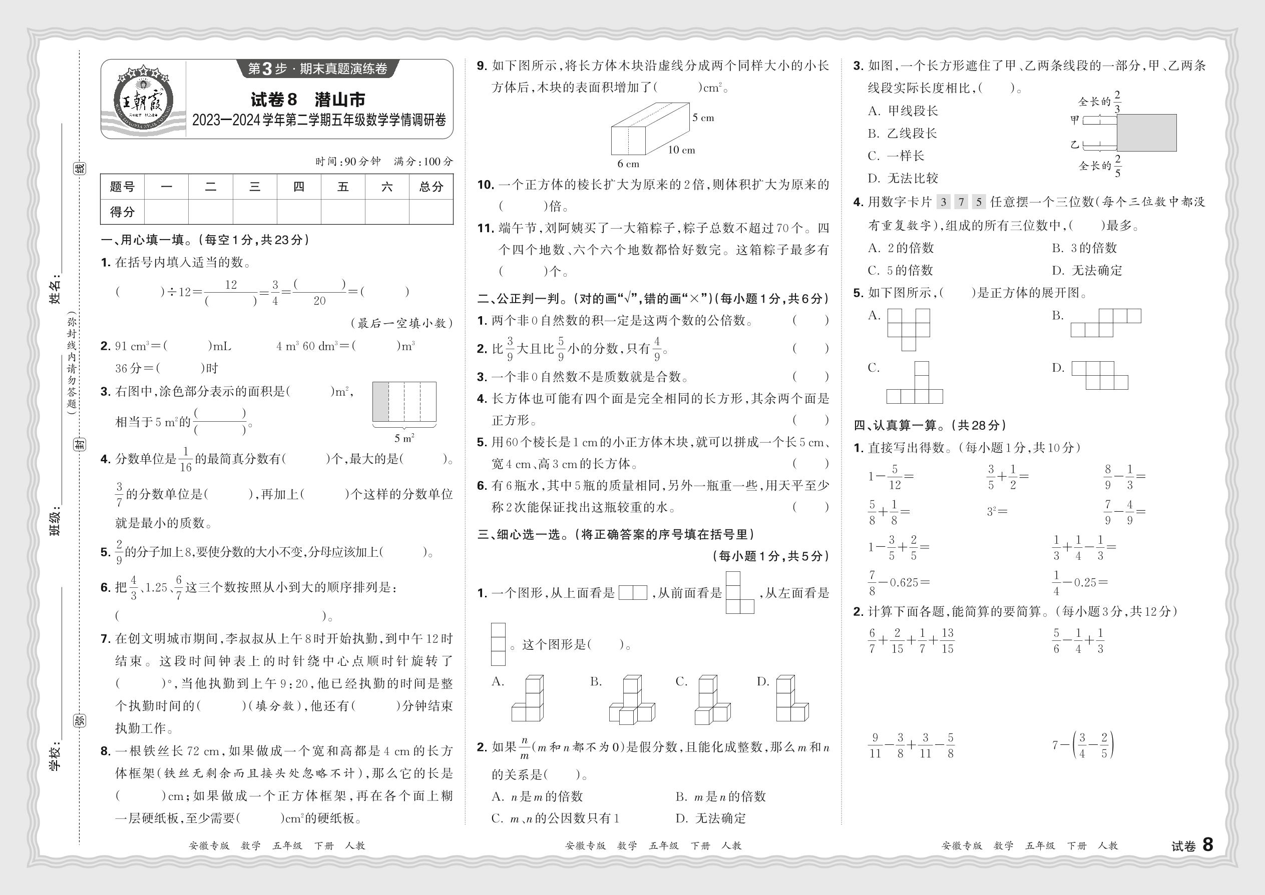 安徽省潜山市2023—2024学年第二学期五年级数学学情调研卷(人教版)【8】