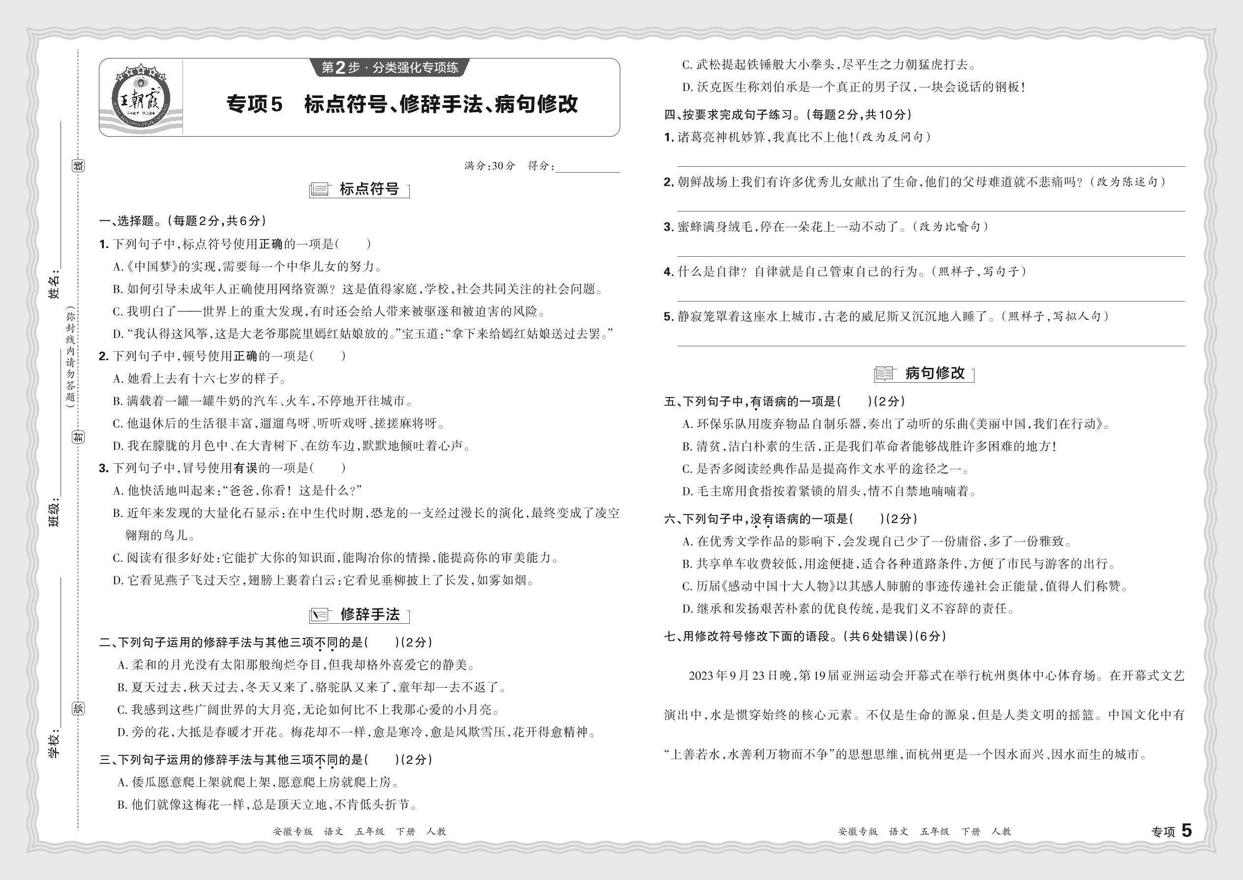 2024春下册五年级语文人教版 期末专项卷安徽版·标点符号、修辞手法、病句修改【5】