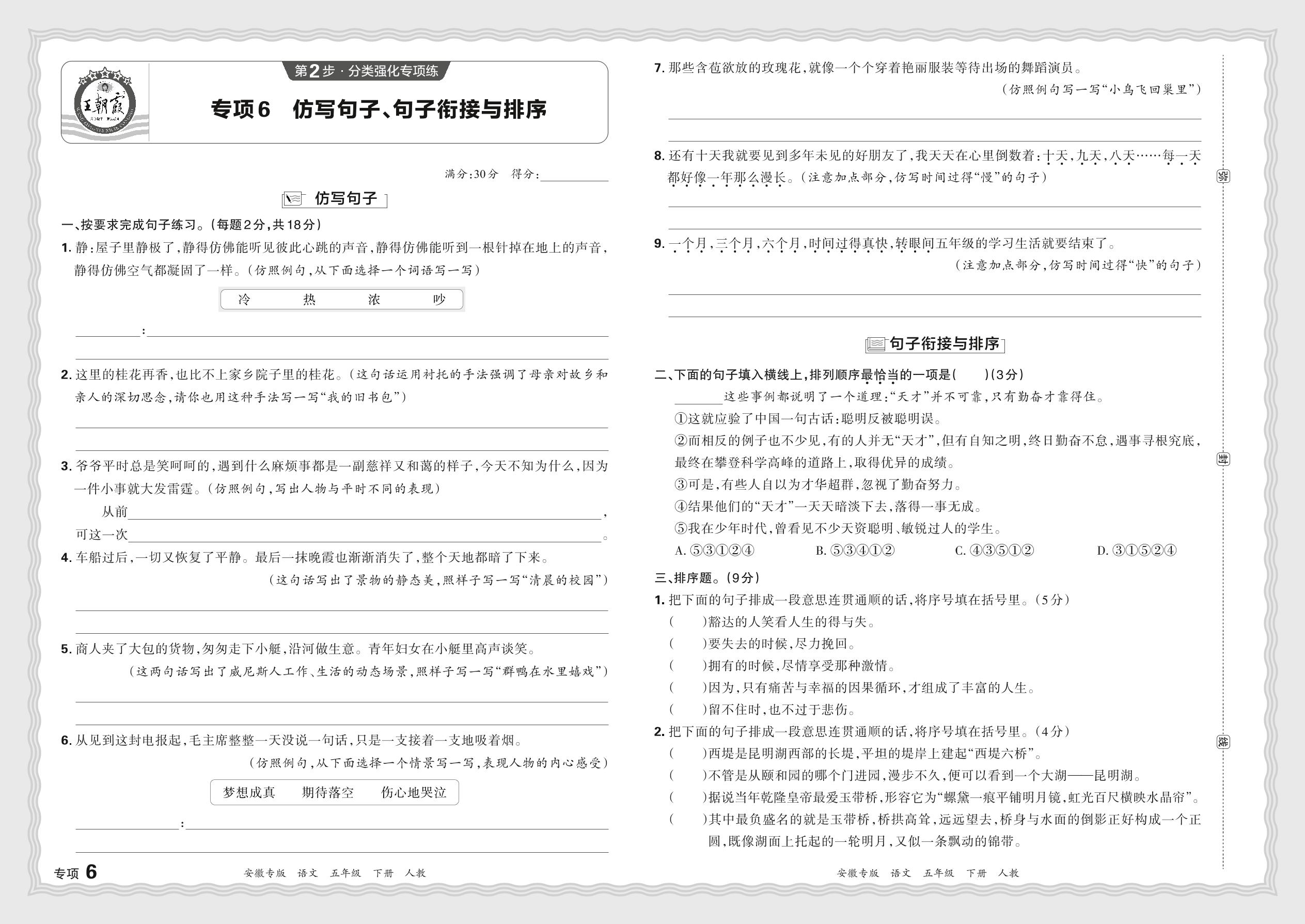 2024春下册五年级语文人教版 期末专项卷安徽版·仿写句子、句子衔接与排序【6】