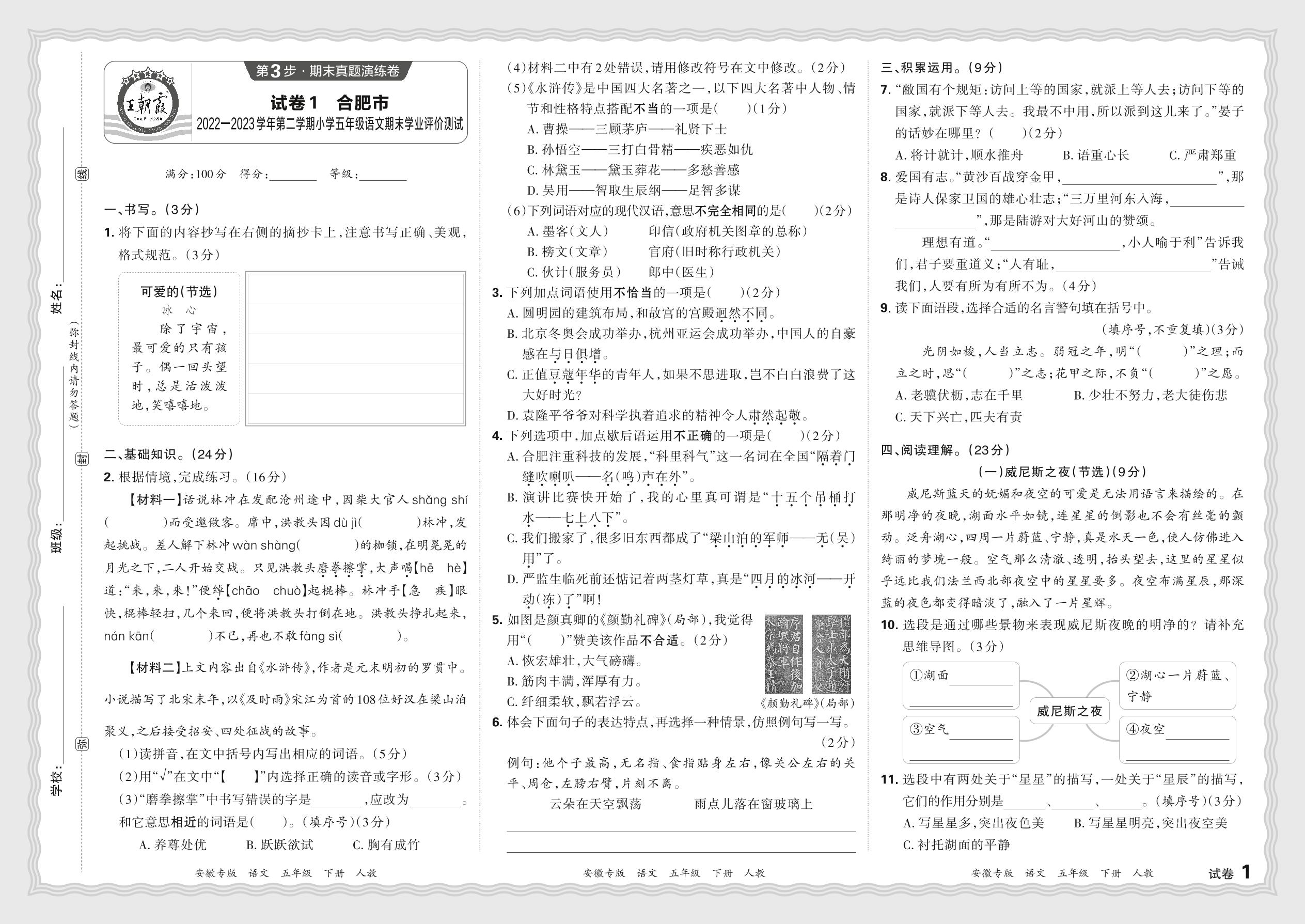 安徽省合肥市2022—2023学年第二学期小学五年级语文期末学业评价测试(人教版)【1】