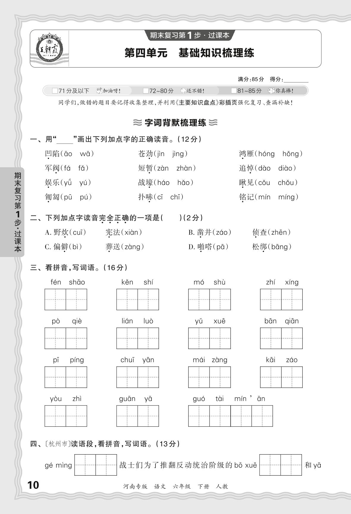 2024春下册六年级语文人教版 期末过课本河南版·第四单元 基础知识梳理练