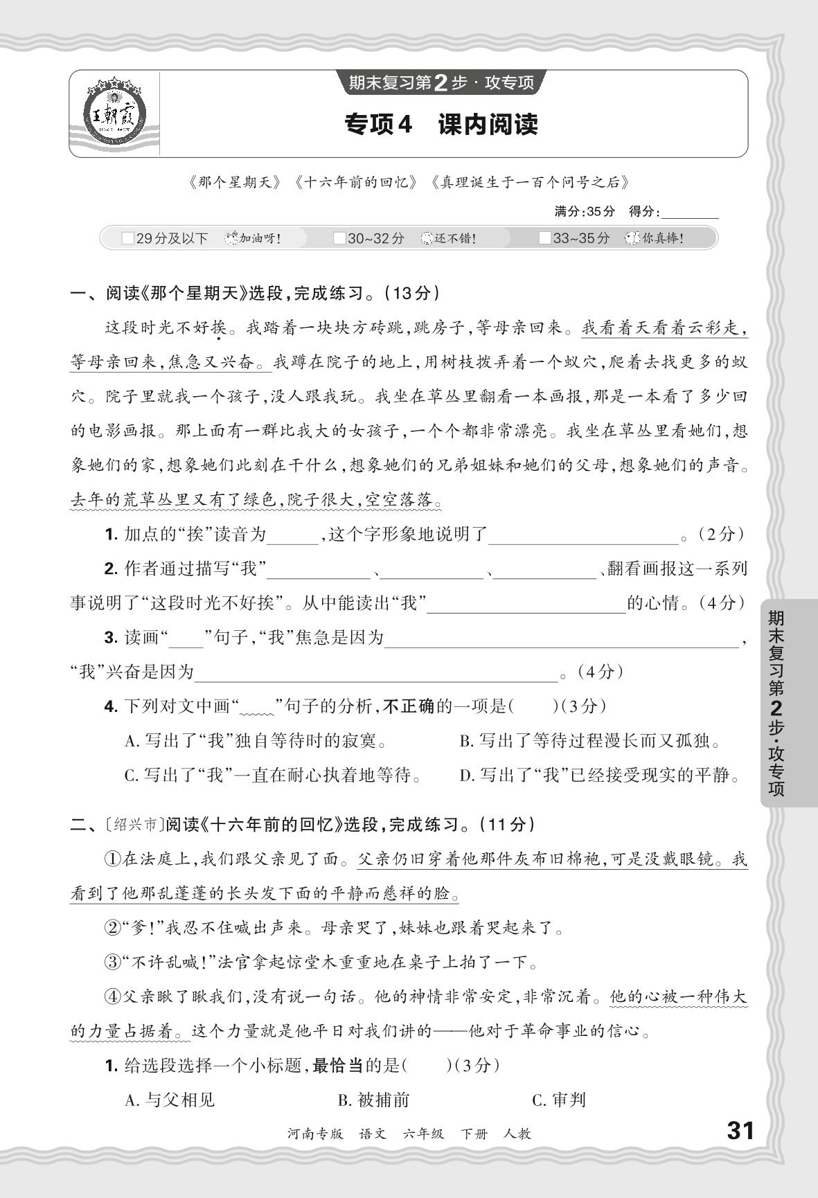 2024春下册六年级语文人教版 期末专项卷河南版·课内阅读【4】