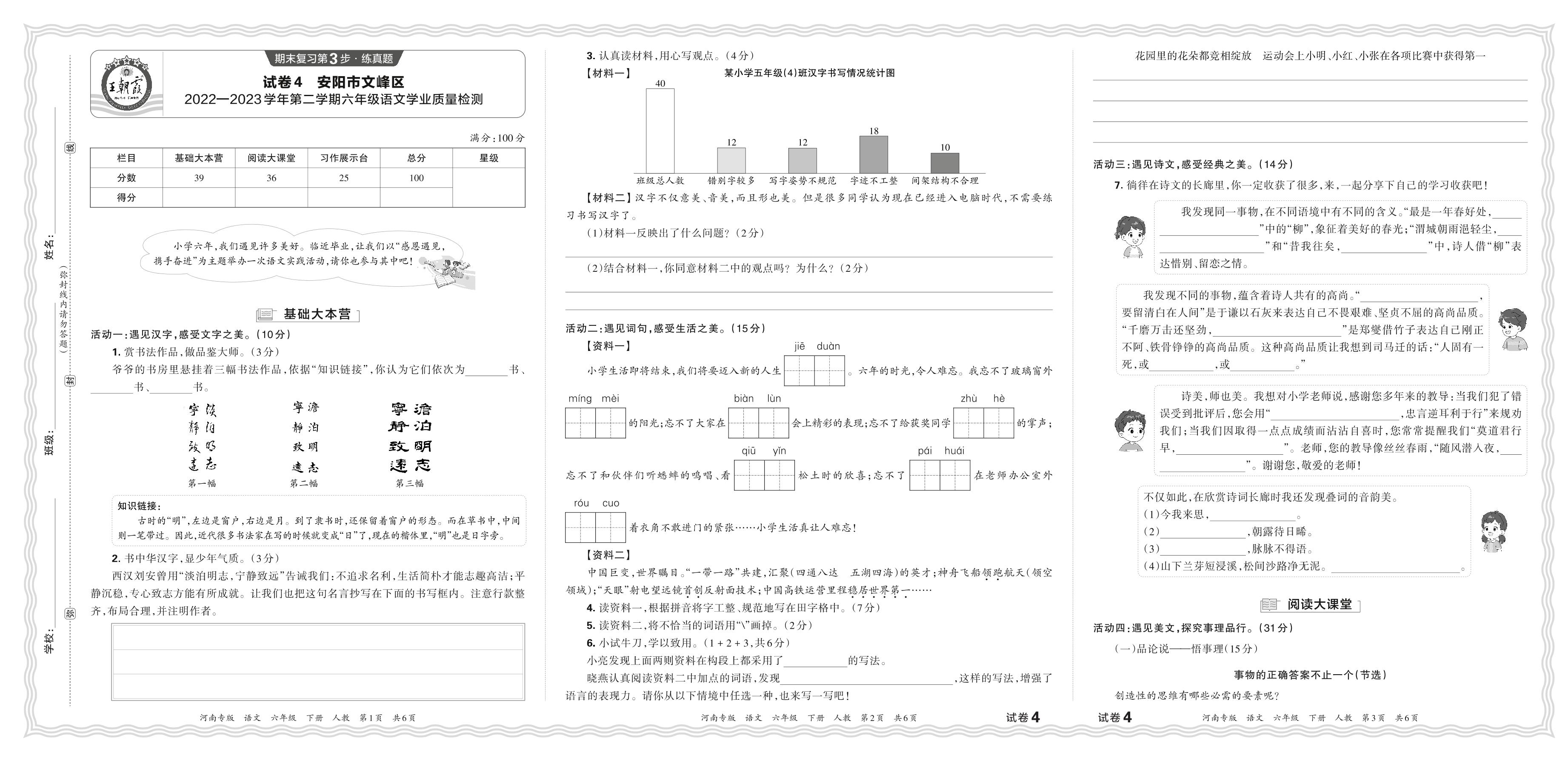 河南省安阳市文峰区2022—2023学年第二学期六年级语文学业质量检测(人教版)【4】