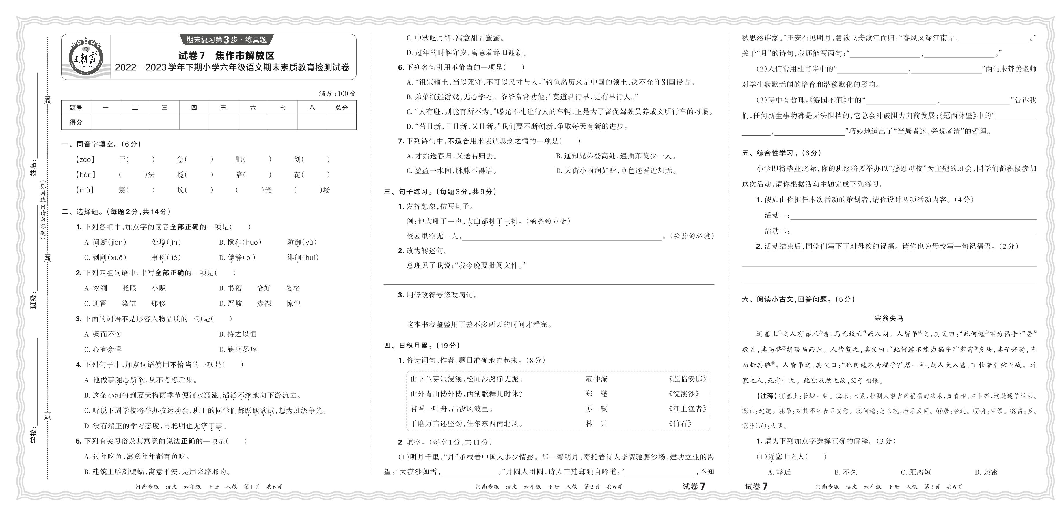河南省焦作市解放区2022—2023学年下期小学六年级语文期末素质教育检测试卷(人教版)【7】