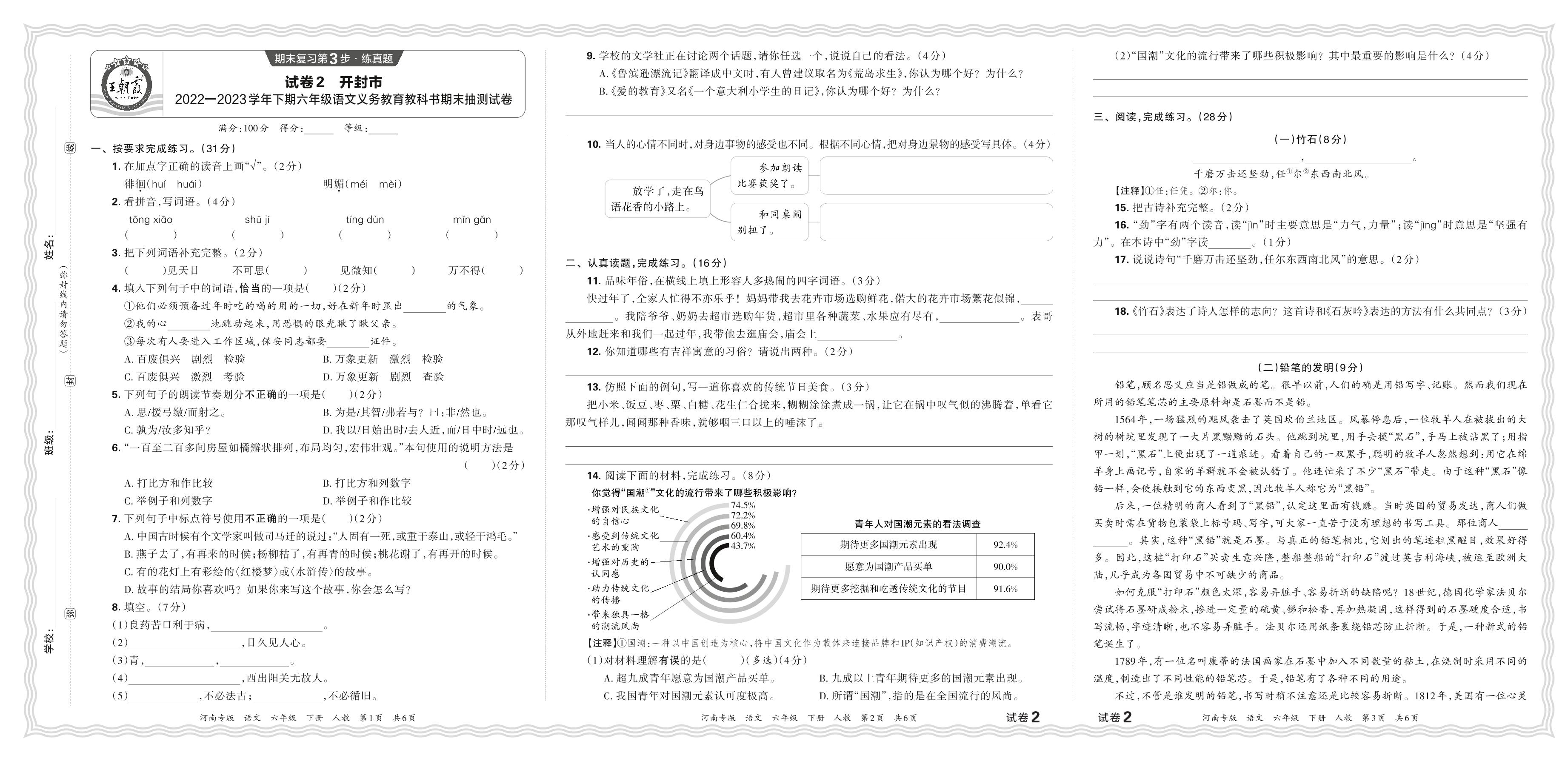 河南省开封市2022—2023学年下期六年级语文义务教育教科书期末抽测试卷(人教版)【2】