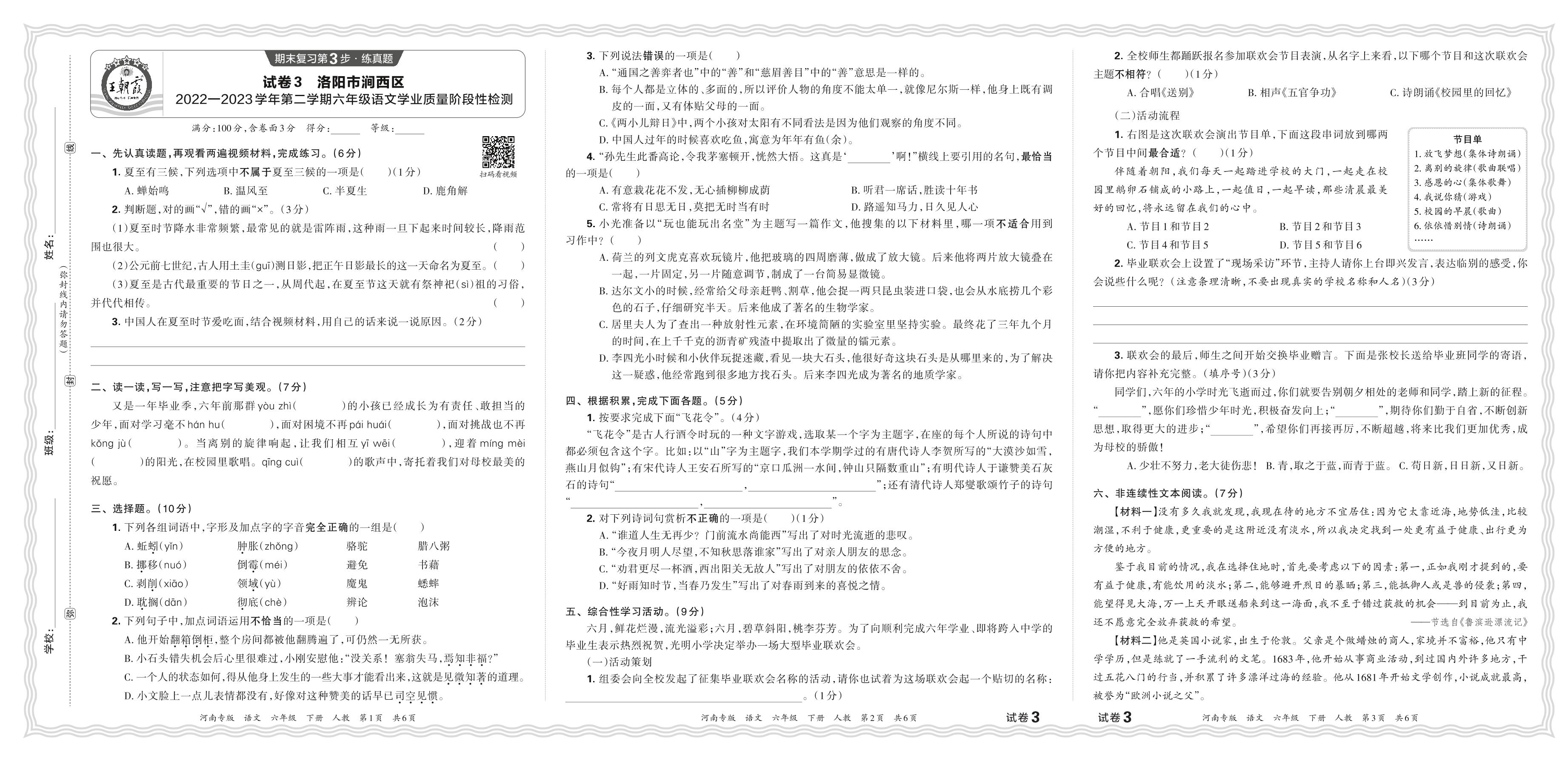 河南省洛阳市涧西区2022—2023学年第二学期六年级语文学业质量阶段性检测(人教版)【3】