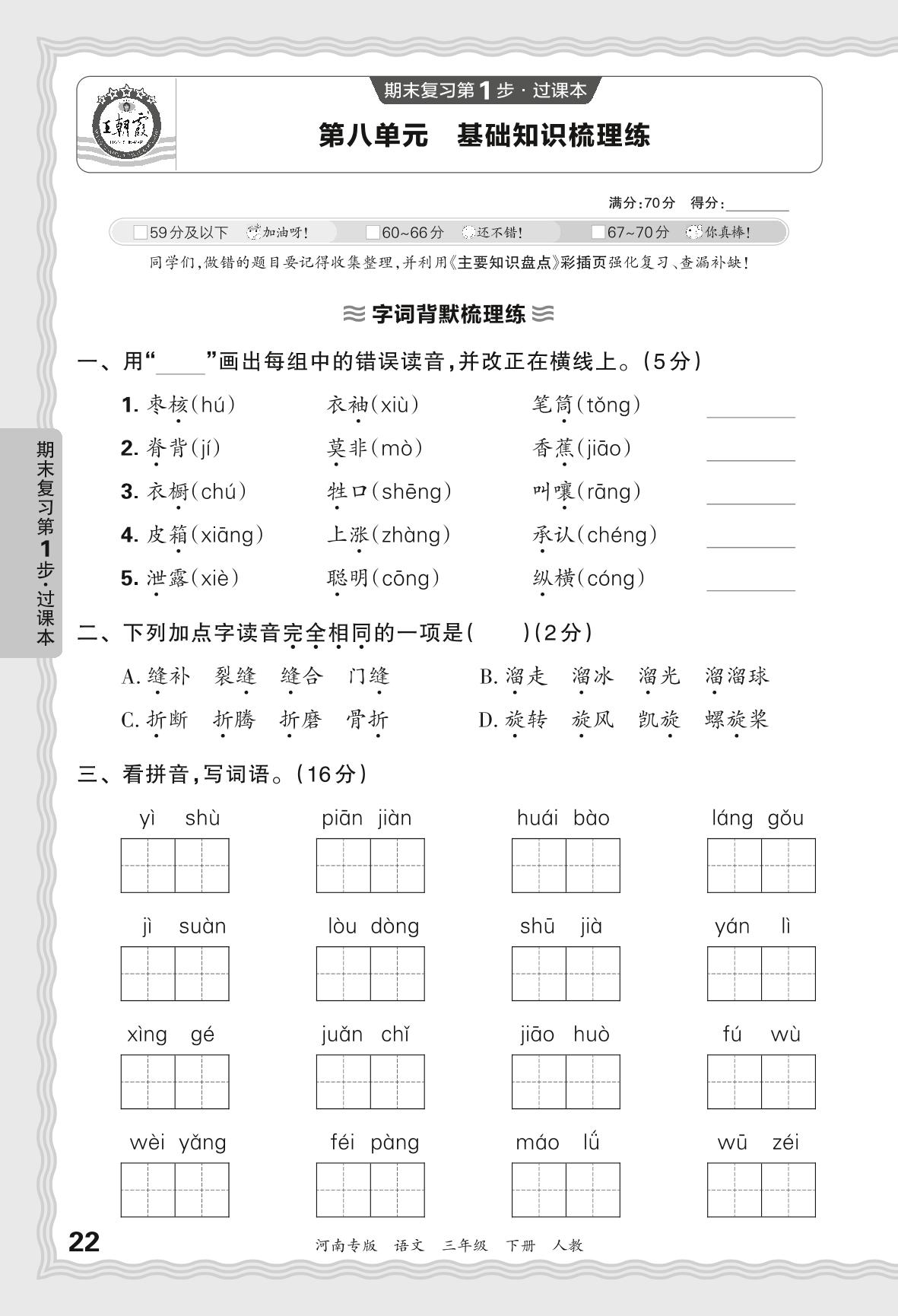 2024春下册三年级语文人教版 期末过课本河南版·第八单元 基础知识梳理练