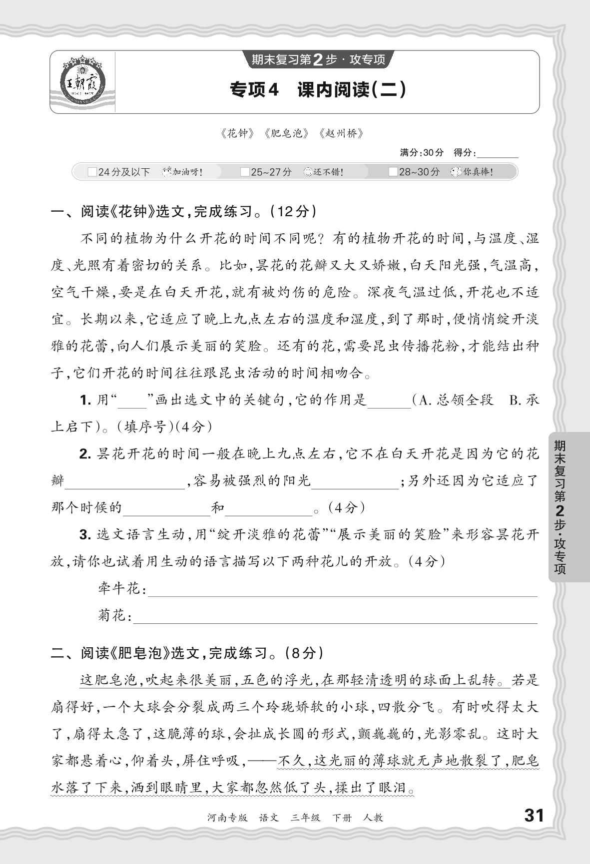 2024春下册三年级语文人教版 期末专项卷河南版·课内阅读(二)【4】