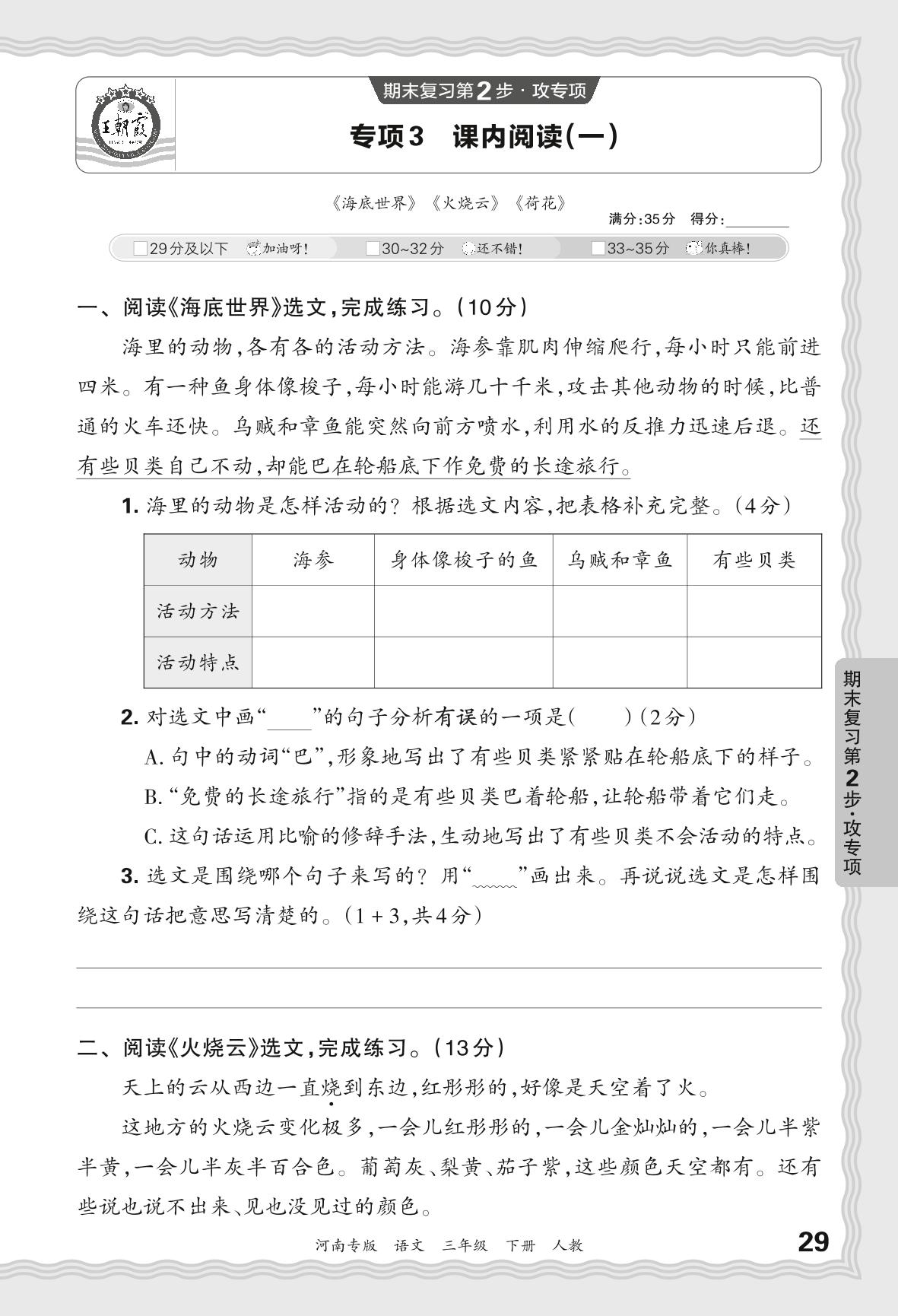2024春下册三年级语文人教版 期末专项卷河南版·课内阅读(一)【3】
