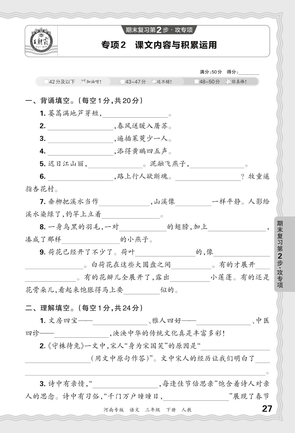 2024春下册三年级语文人教版 期末专项卷河南版·课文内容与积累运用【2】