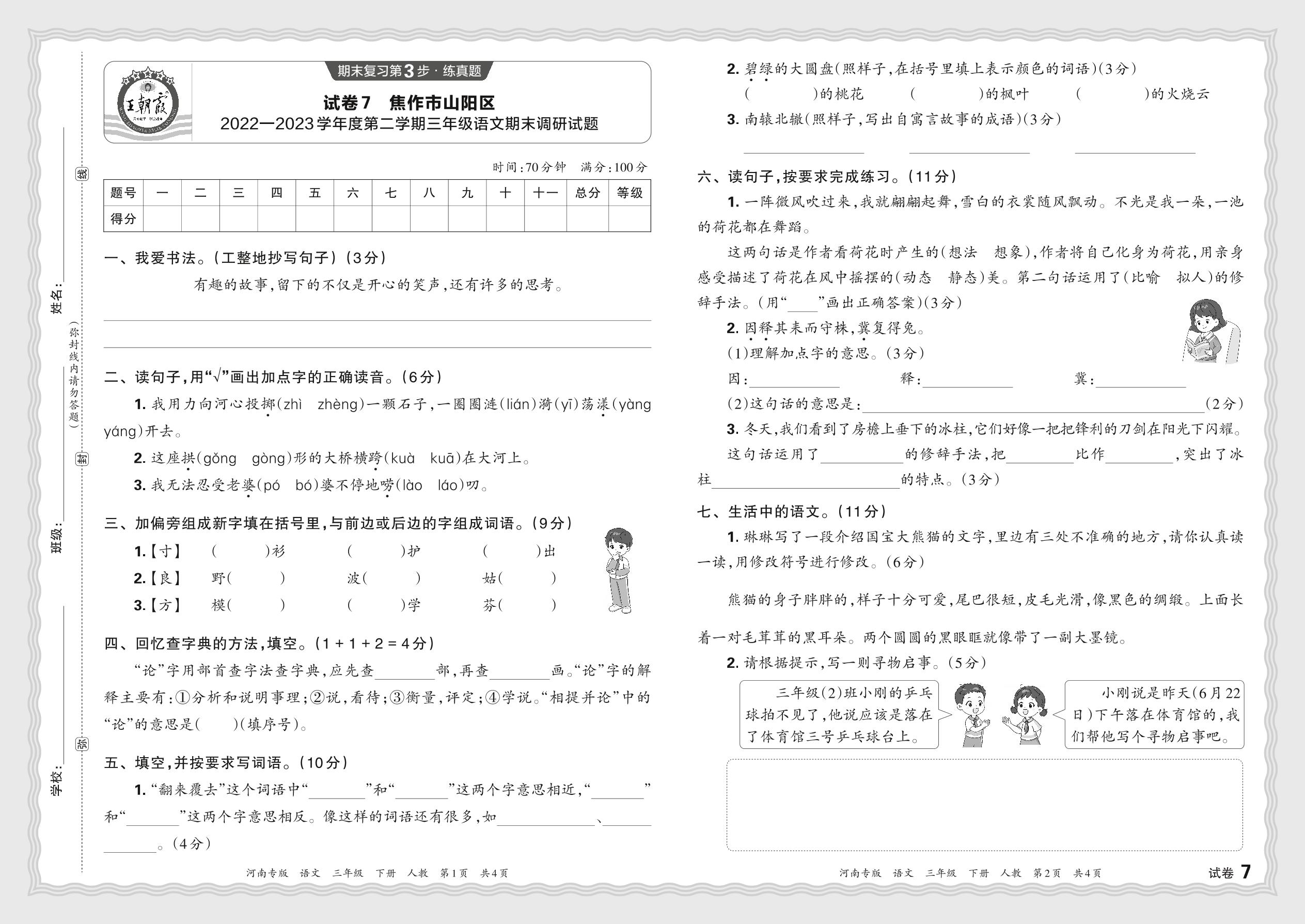 河南省焦作市山阳区2022—2023学年度第二学期三年级语文期末调研试题(人教版)【7】