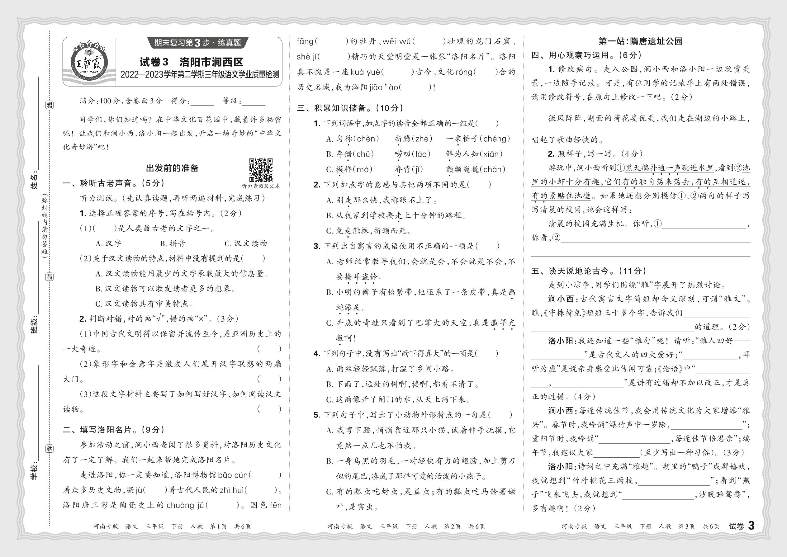 河南省洛阳市涧西区2022—2023学年第二学期三年级语文学业质量检测(人教版)【3】