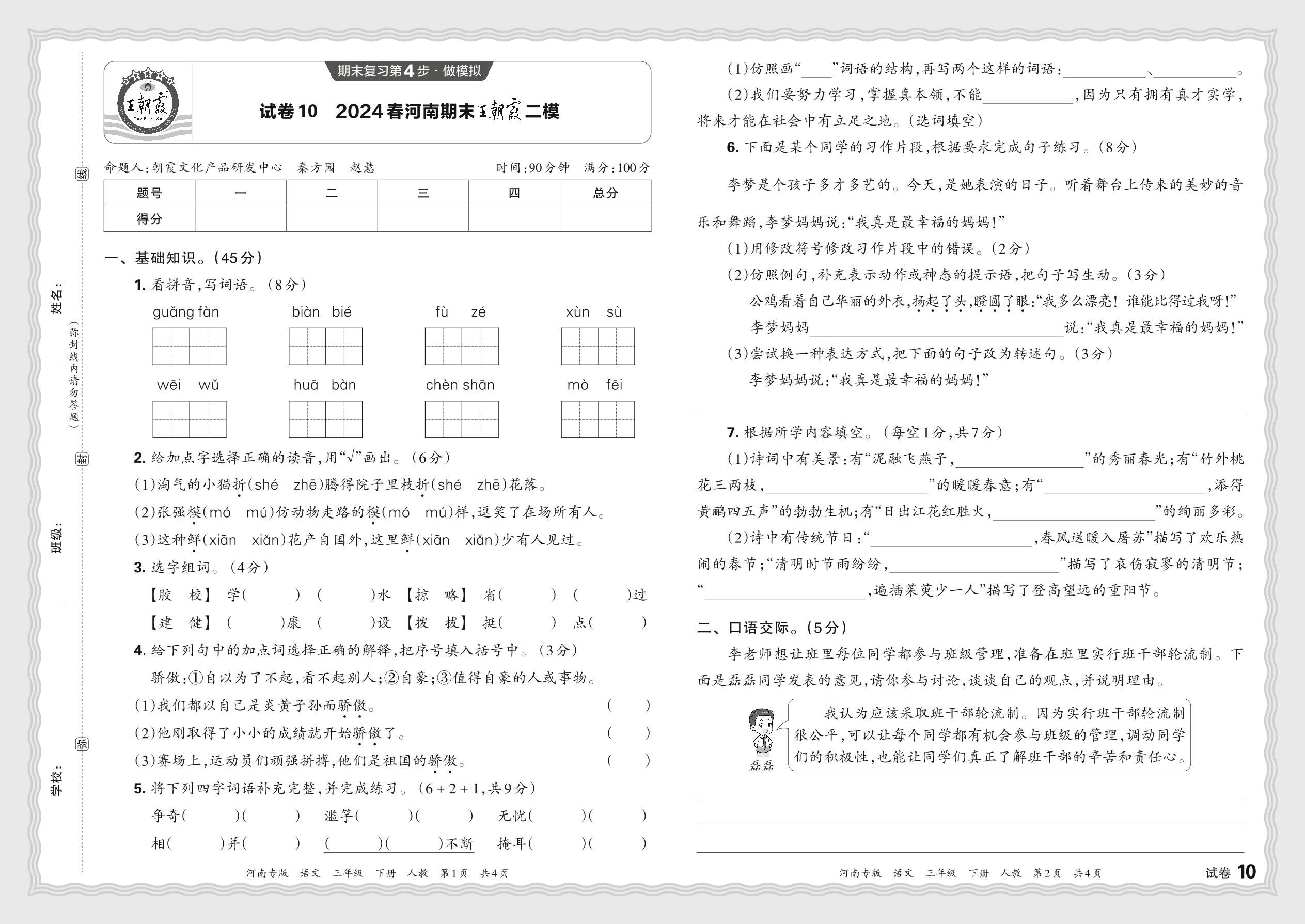 2024春下册三年级语文人教版 河南期末王朝霞二模