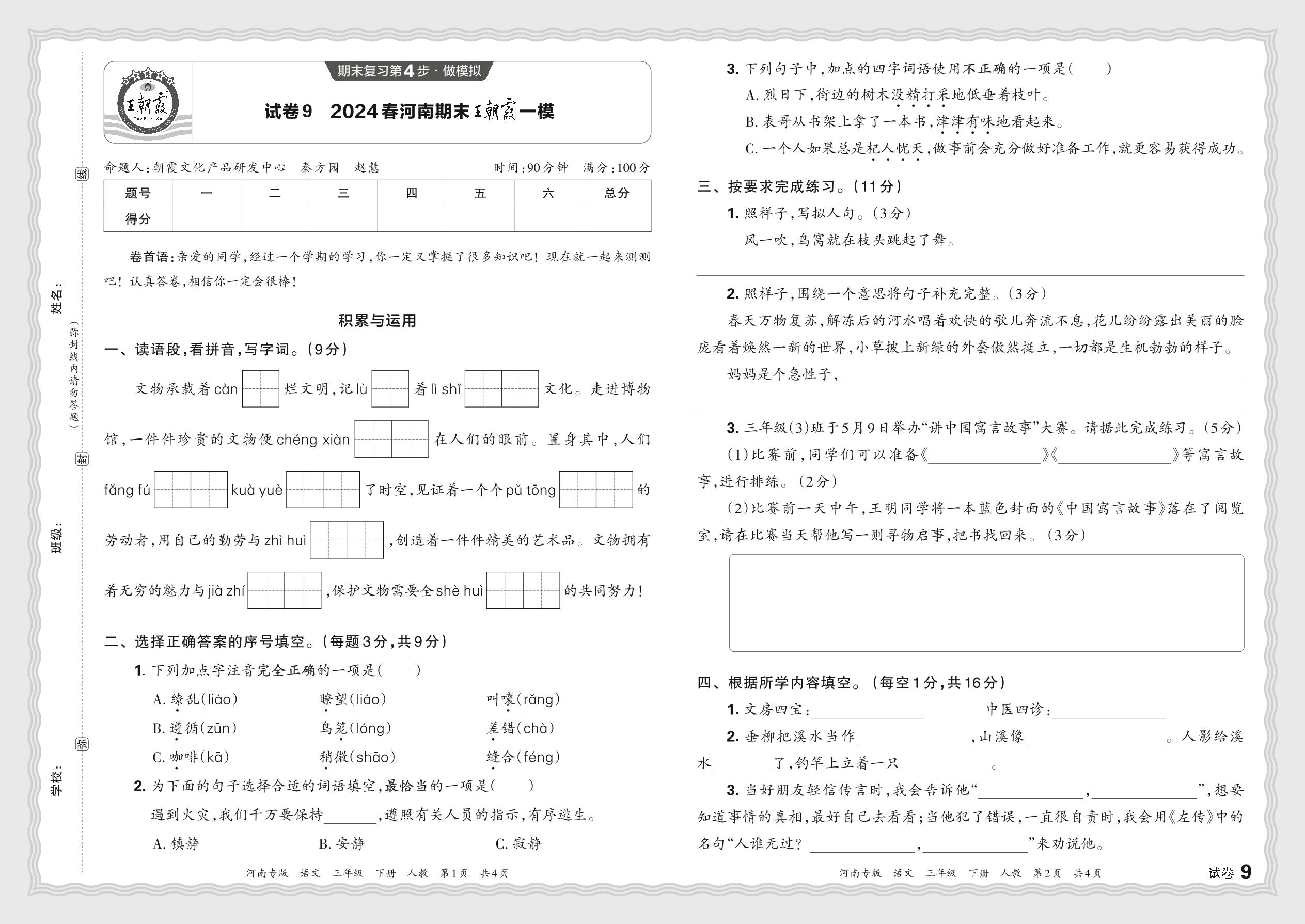 2024春下册三年级语文人教版 河南期末王朝霞一模
