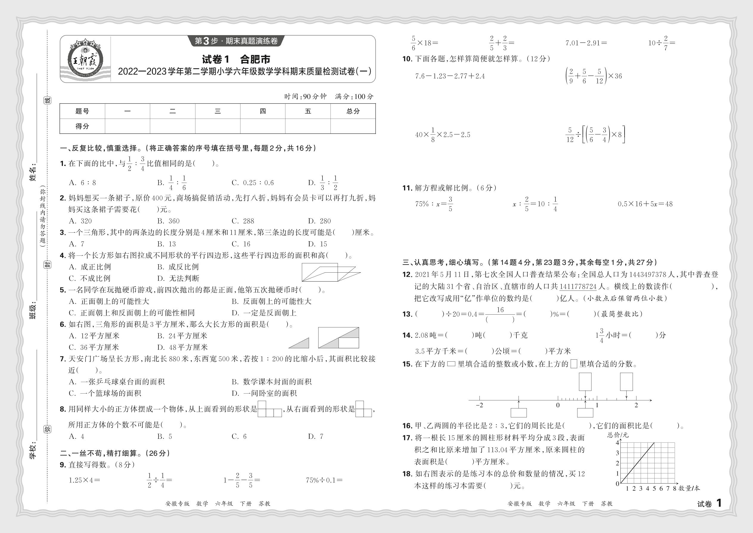 安徽省合肥市2022—2023学年第二学期小学六年级数学学科期末质量检测试卷(一)(苏教版)【1】