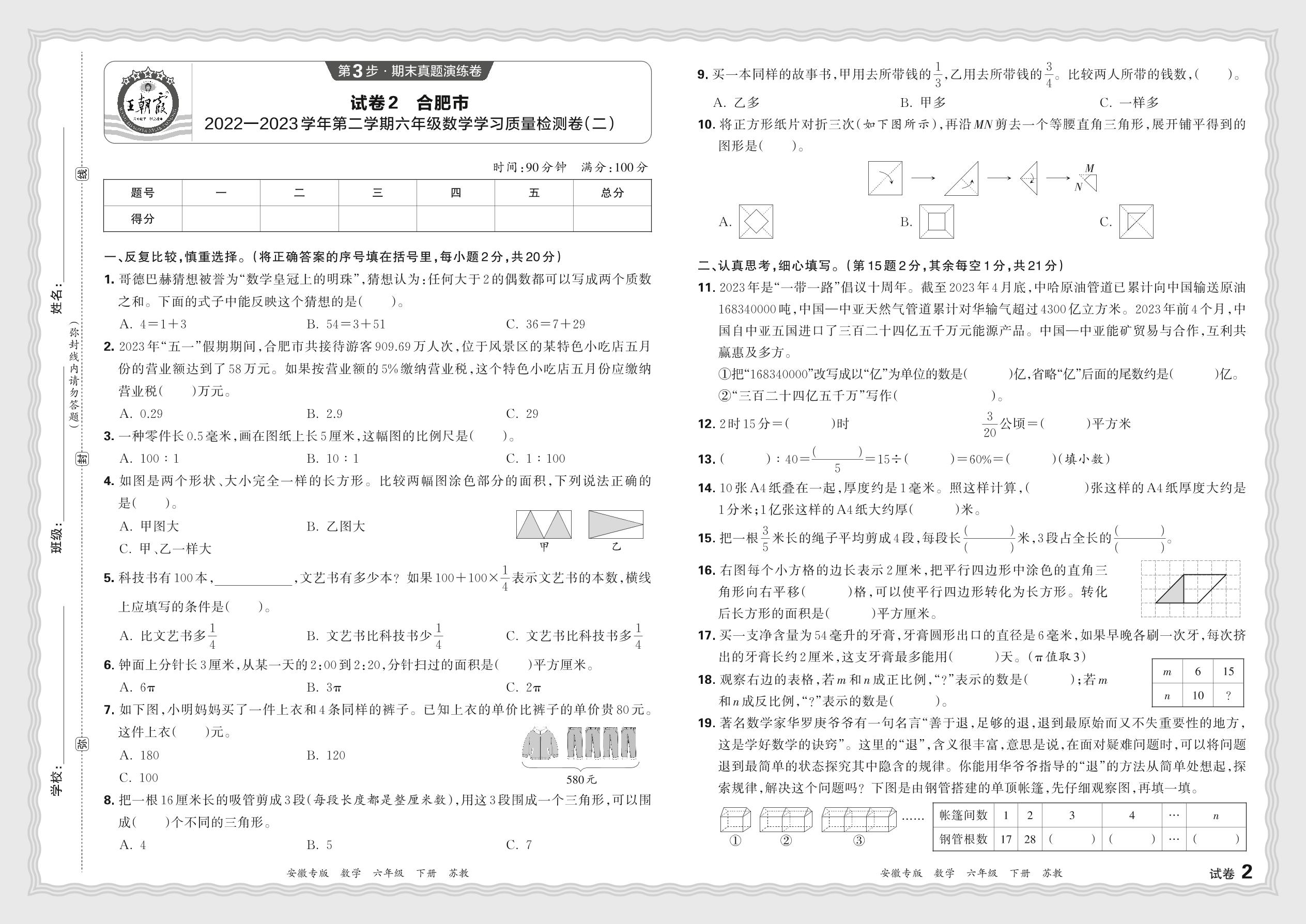 安徽省合肥市2022—2023学年第二学期六年级数学学习质量检测卷(二)(苏教版)【2】