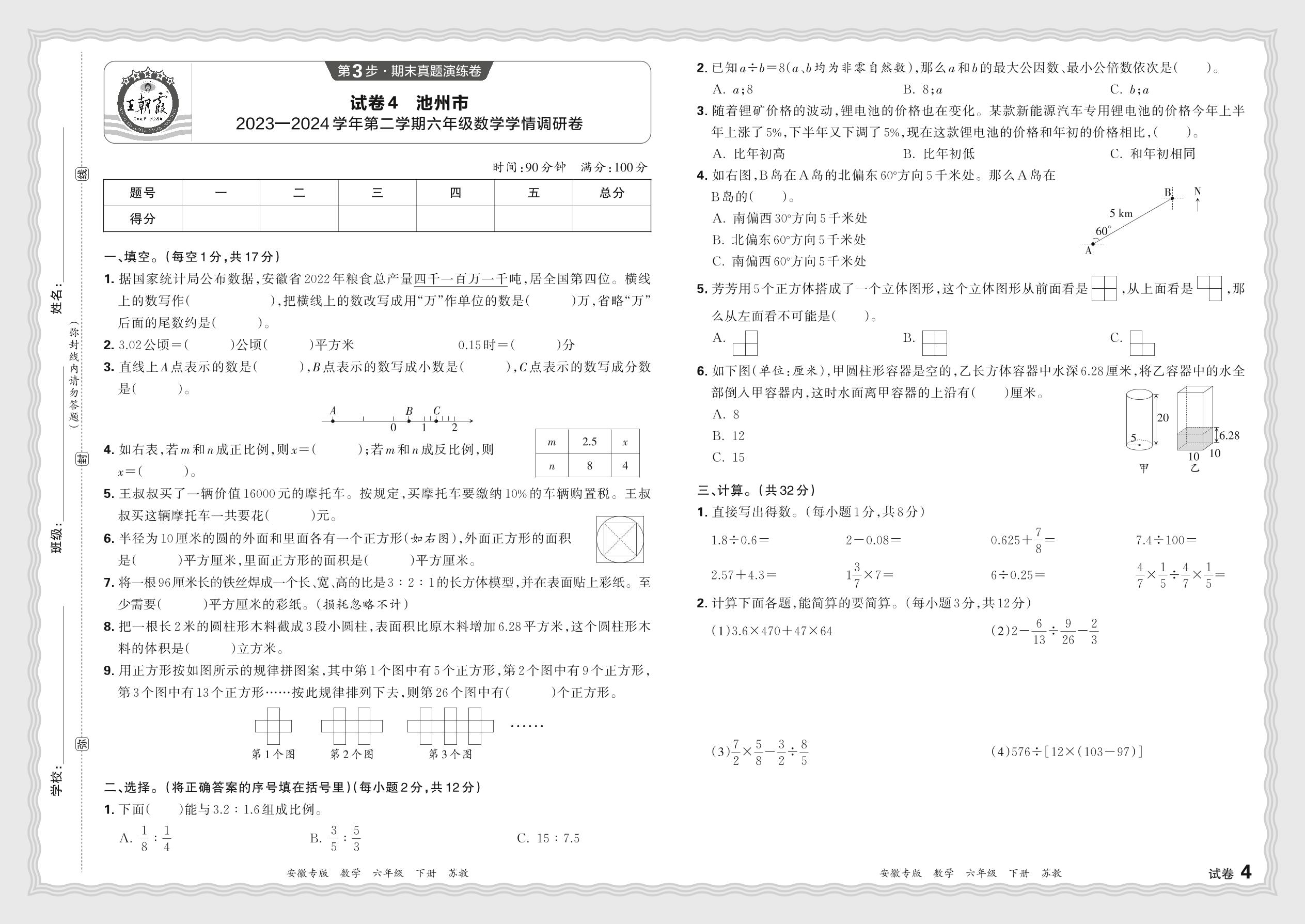 安徽省池州市2023—2024学年第二学期六年级数学学情调研卷(苏教版)【4】