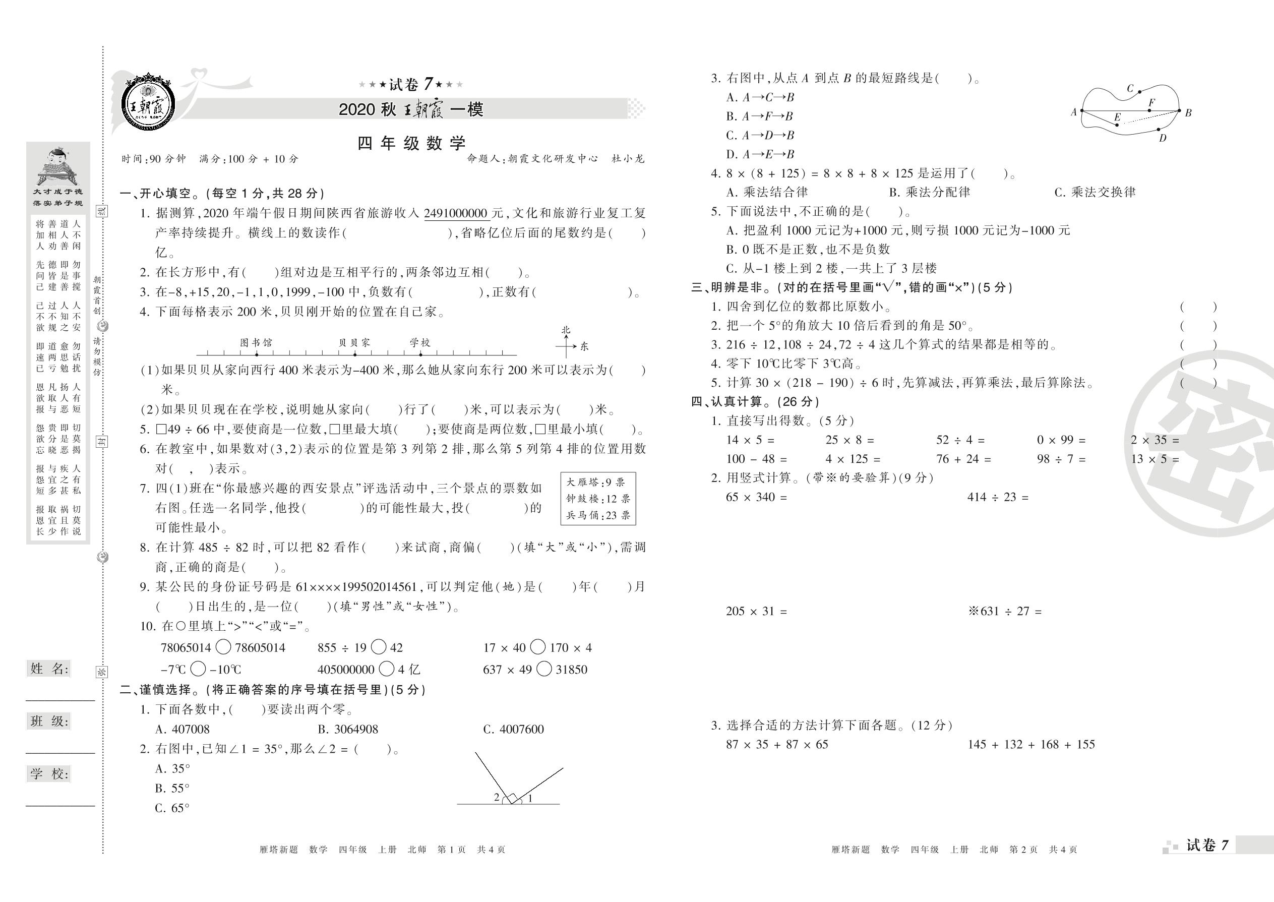 王朝霞期末模拟卷四年级上册数学(北师版)_R210804140244【7】