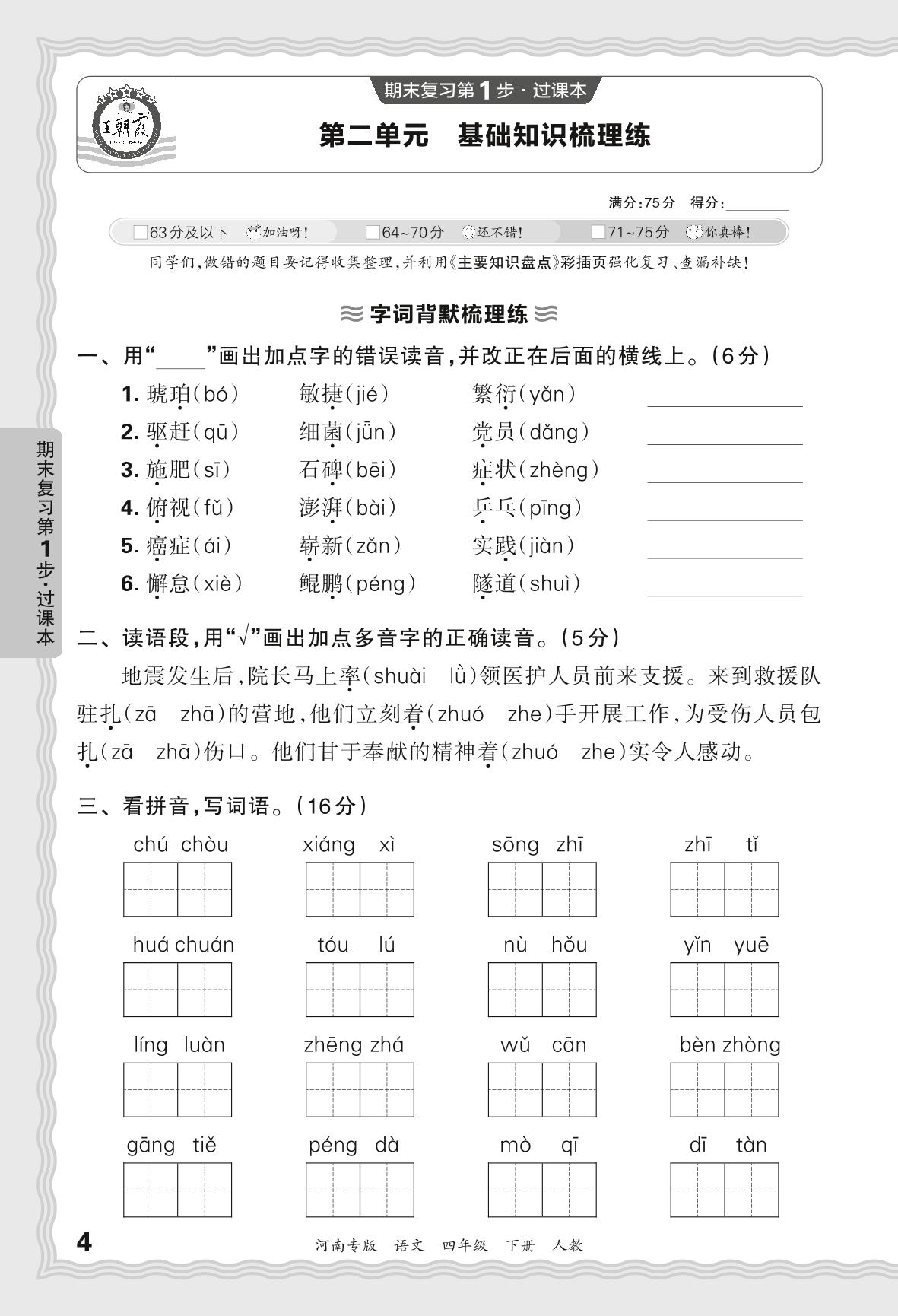 2024春下册四年级语文人教版 期末过课本河南版·第二单元 基础知识梳理练