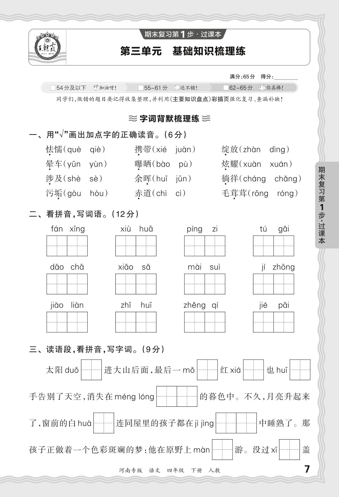 2024春下册四年级语文人教版 期末过课本河南版·第三单元 基础知识梳理练