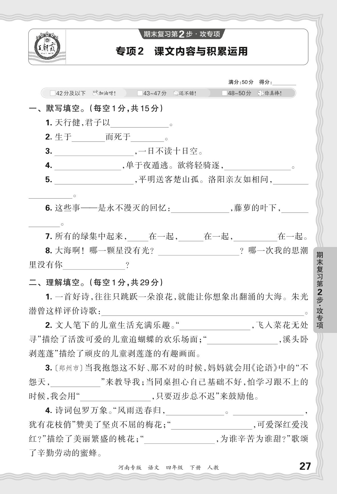 2024春下册四年级语文人教版 期末专项卷河南版·课文内容与积累运用【2】