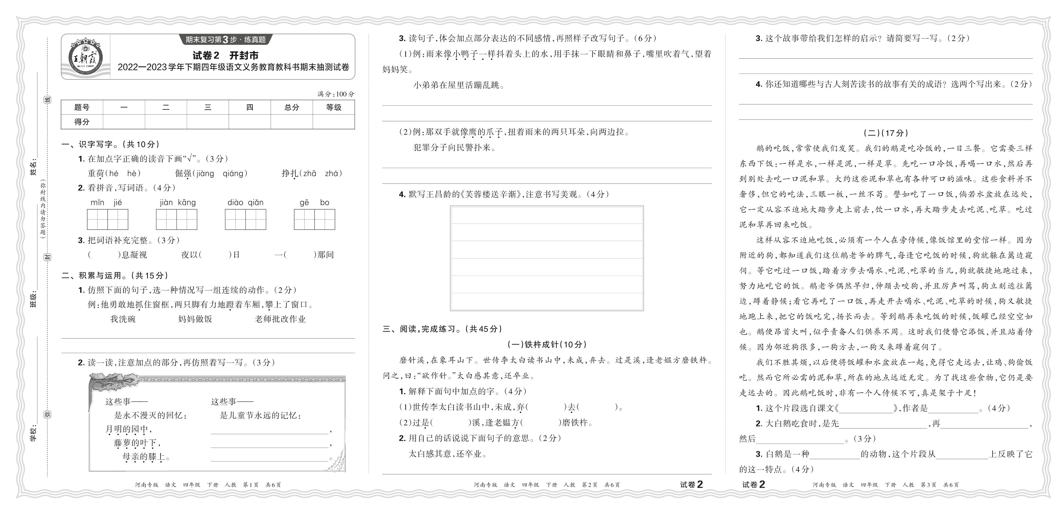 河南省开封市2022—2023学年下期四年级语文义务教育教科书期末抽测试卷(人教版)【2】