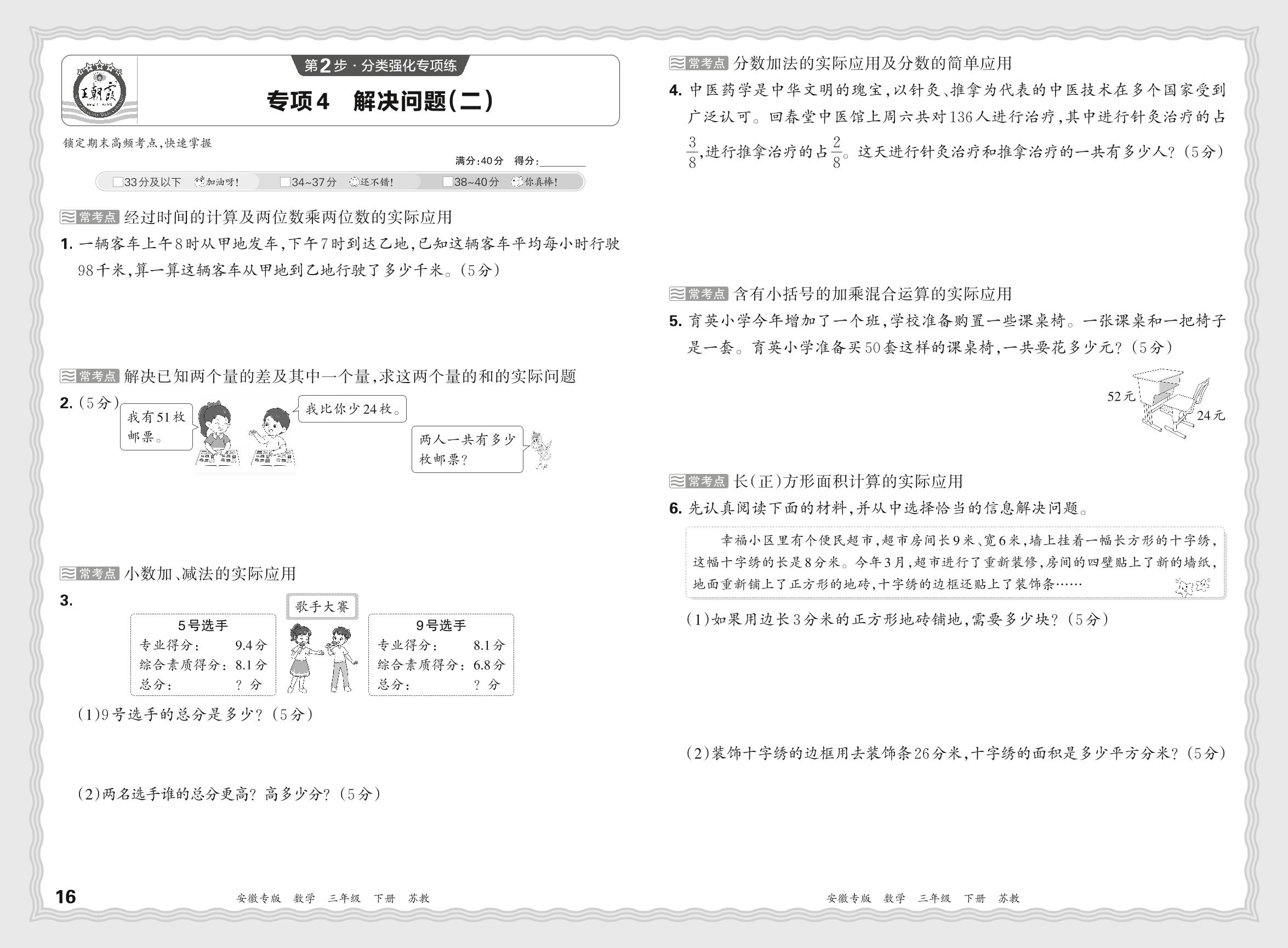 2024春下册三年级数学苏教版 期末专项卷安徽版·解决问题(二)【4】