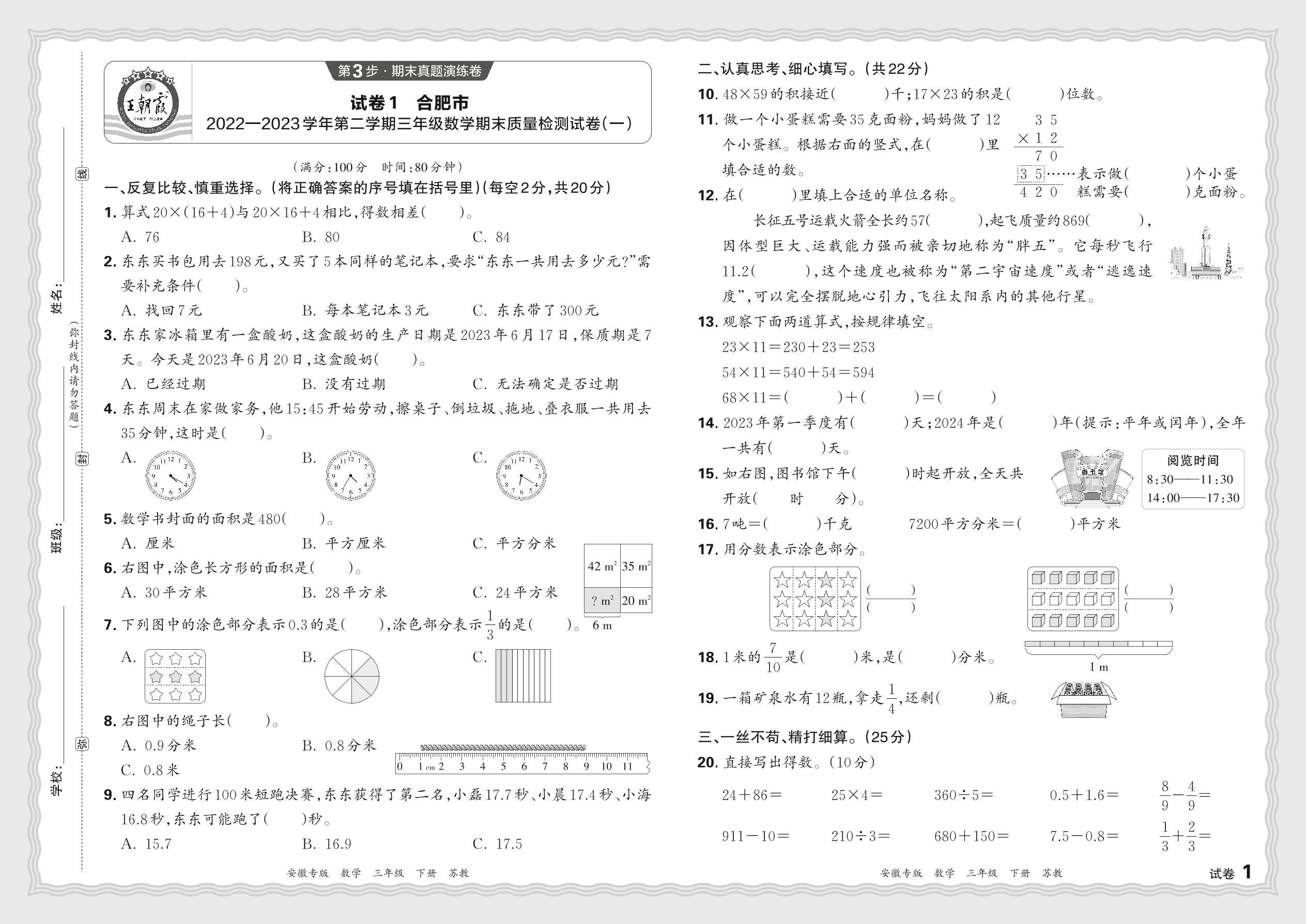 安徽省合肥市2022—2023学年第二学期三年级数学期末质量检测试卷(一)(苏教版)【1】