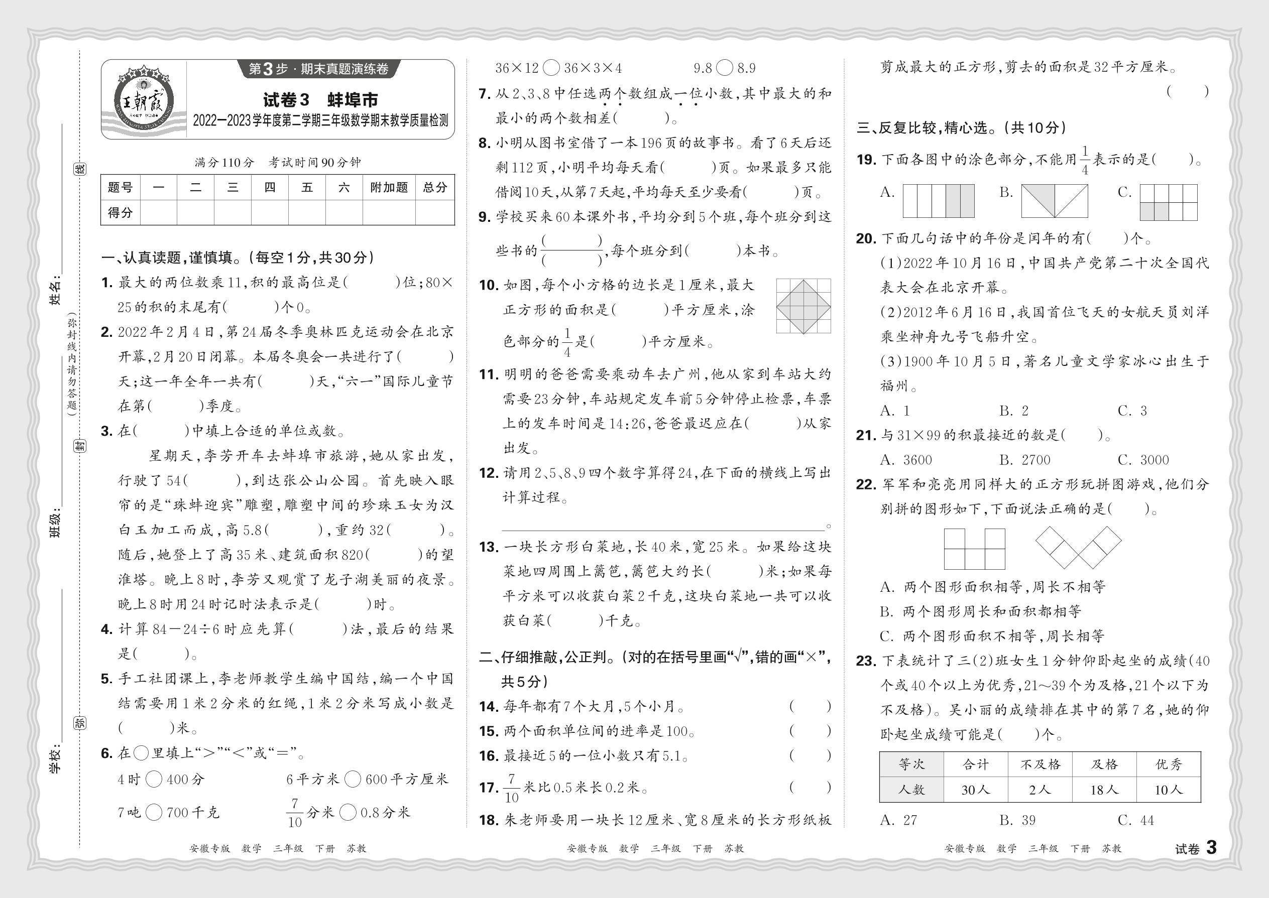 安徽省蚌埠市2022—2023学年度第二学期三年级数学期末教学质量检测(苏教版)【3】