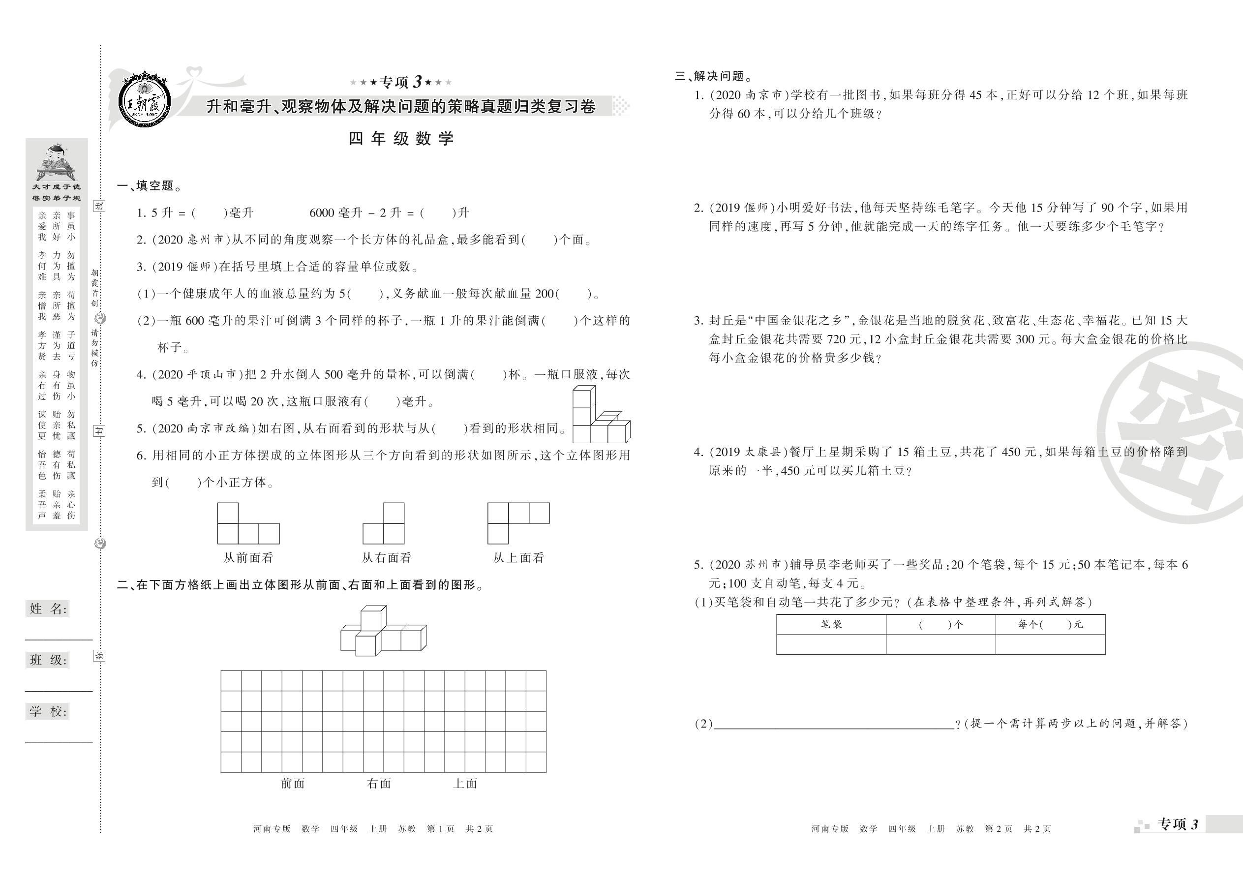 王朝霞期末专项卷——升和毫升、观察物体及解决问题的策略、可能性和统计表及条形统计图真题归类复习四年级上册数学(苏教版)【0】