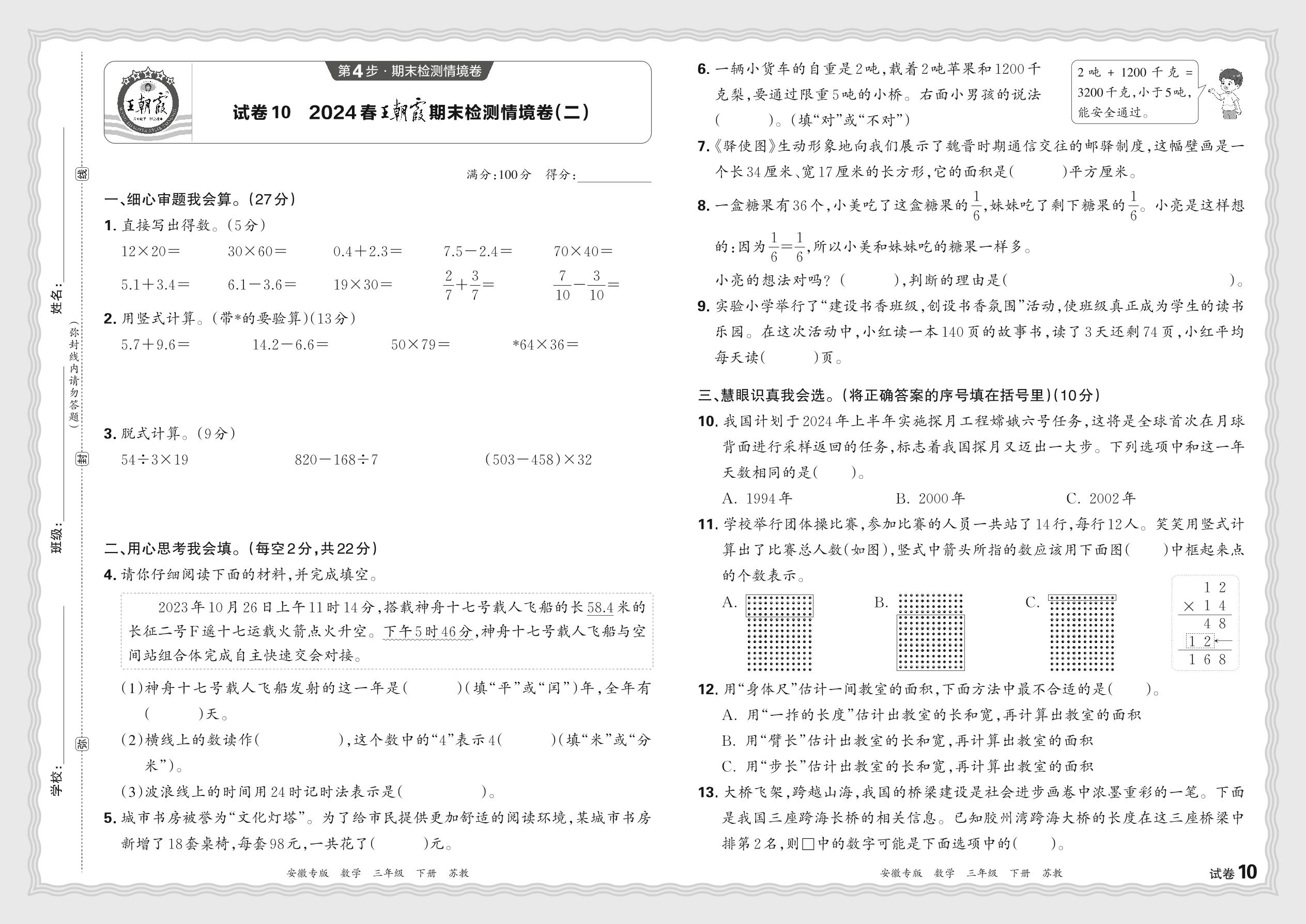 2024春下册三年级数学苏教版 王朝霞期末检测情境卷(二)