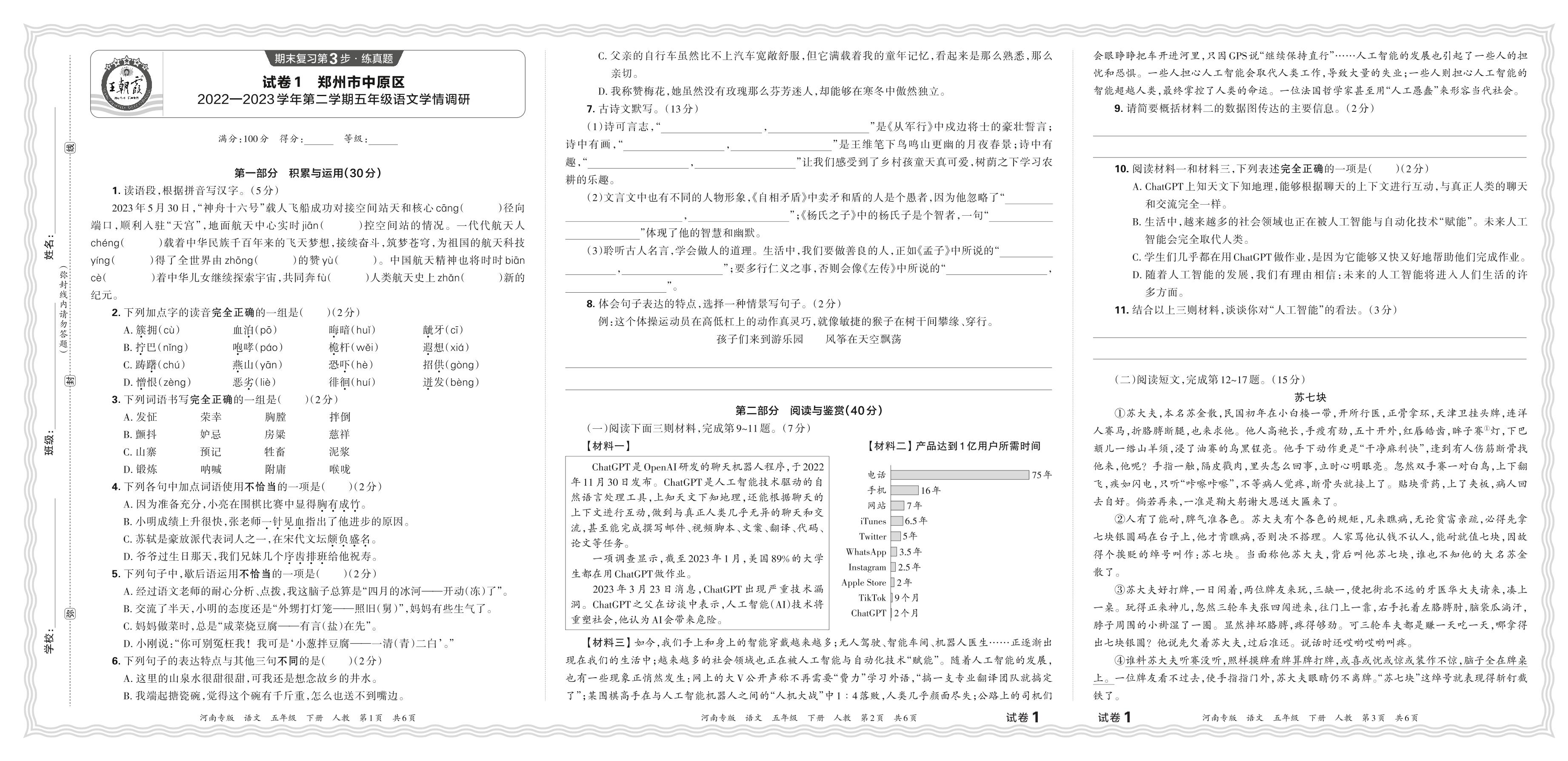 河南省郑州市中原区2022—2023学年第二学期五年级语文学情调研(人教版)【1】