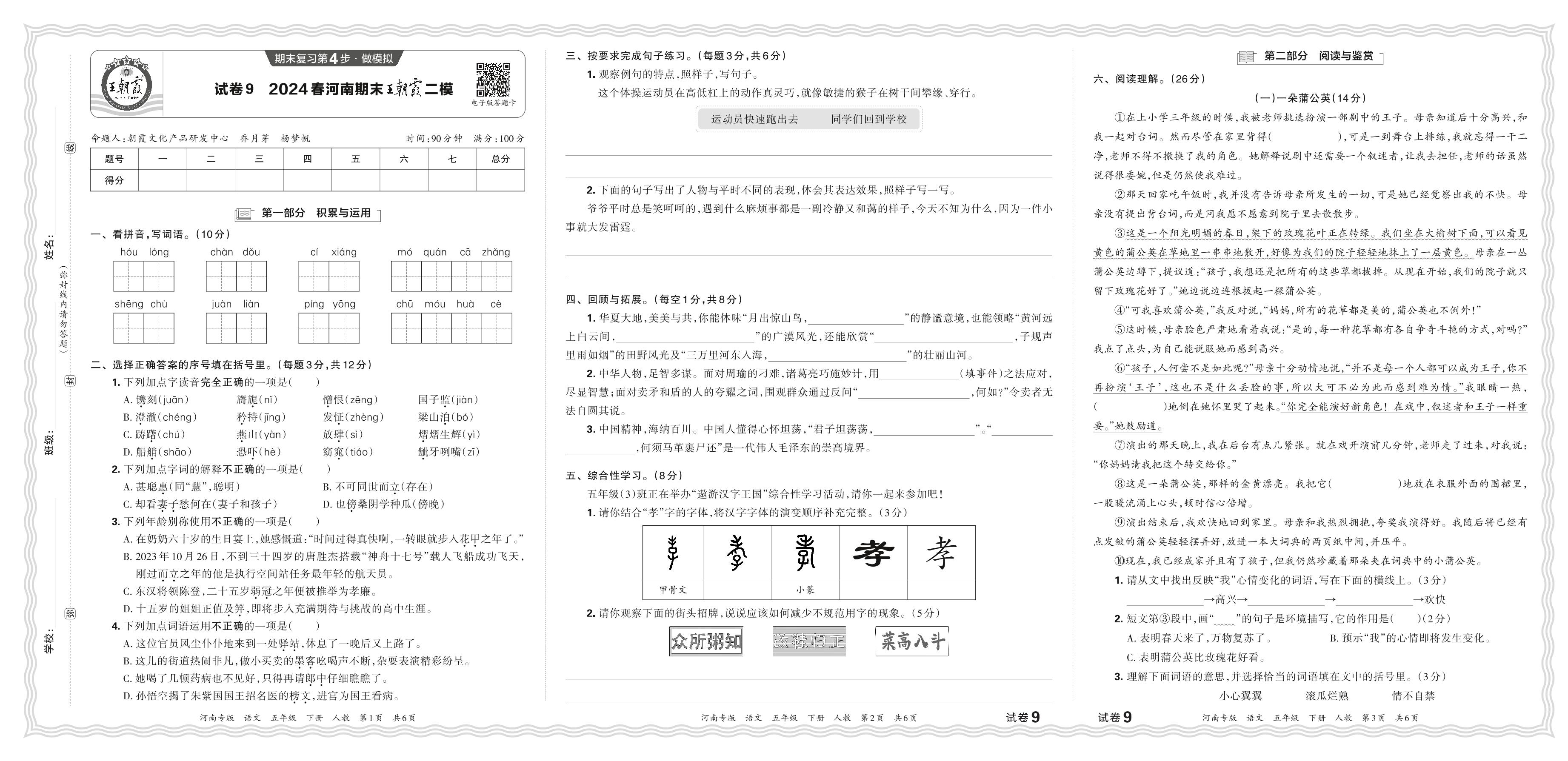 2024春下册五年级语文人教版 河南期末王朝霞二模