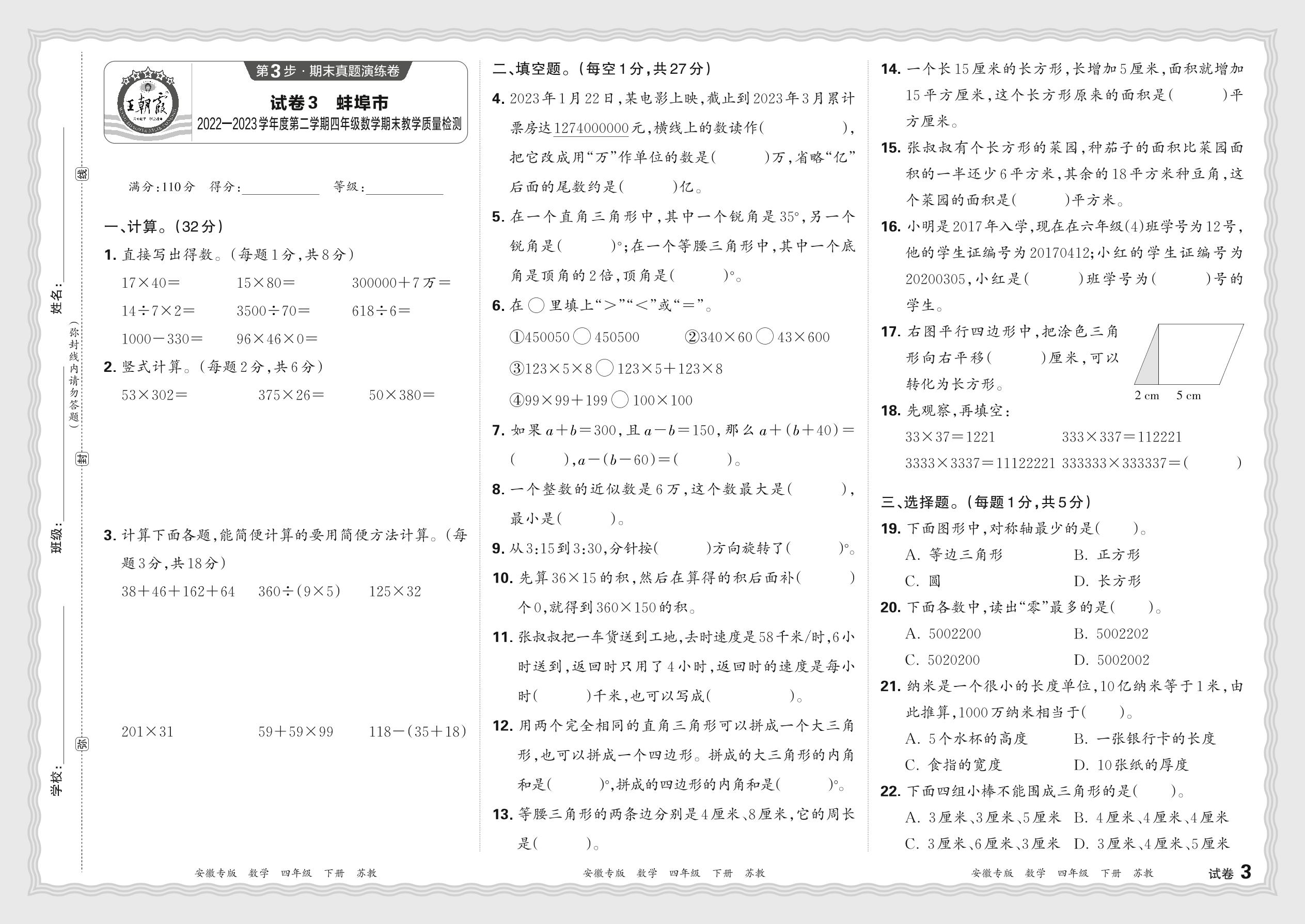 安徽省蚌埠市2022—2023学年度第二学期四年级数学期末教学质量检测(苏教版)【3】