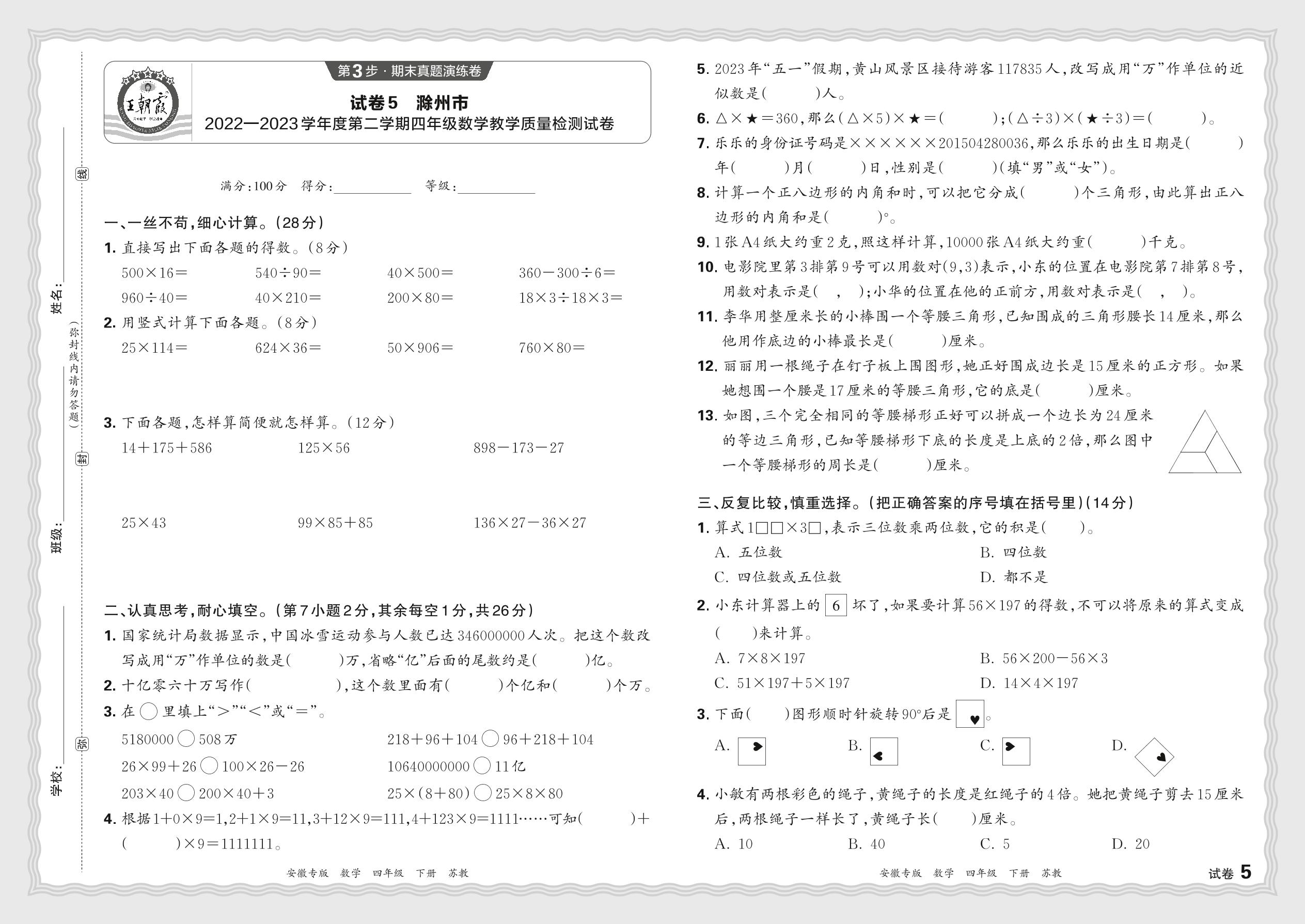 安徽省滁州市2022-2023学年度第二学期四年级数学教学质量检测试卷(苏教版)【5】