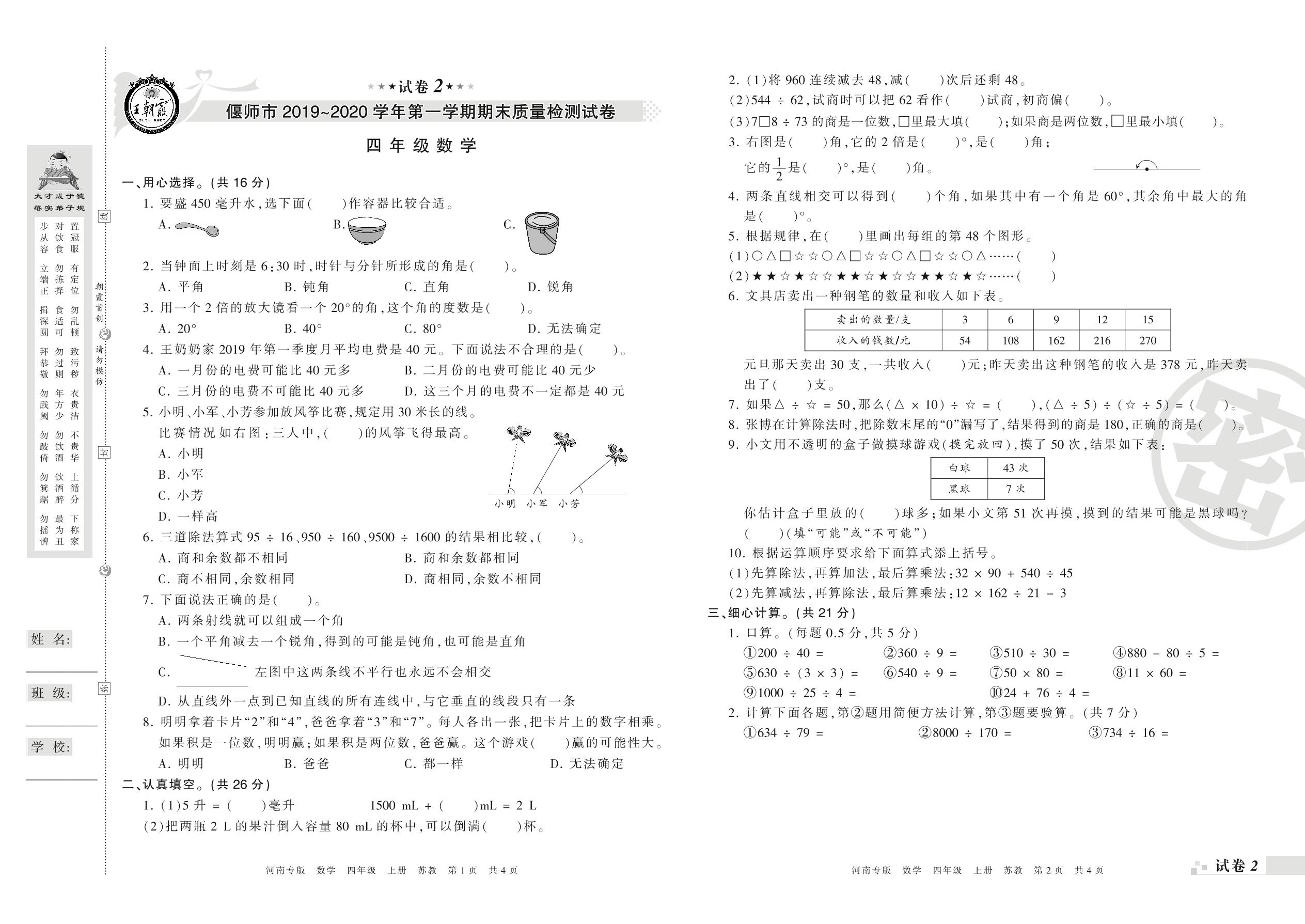 2019-2020学年第一学期偃师市四年级数学试卷(苏教版)【2】