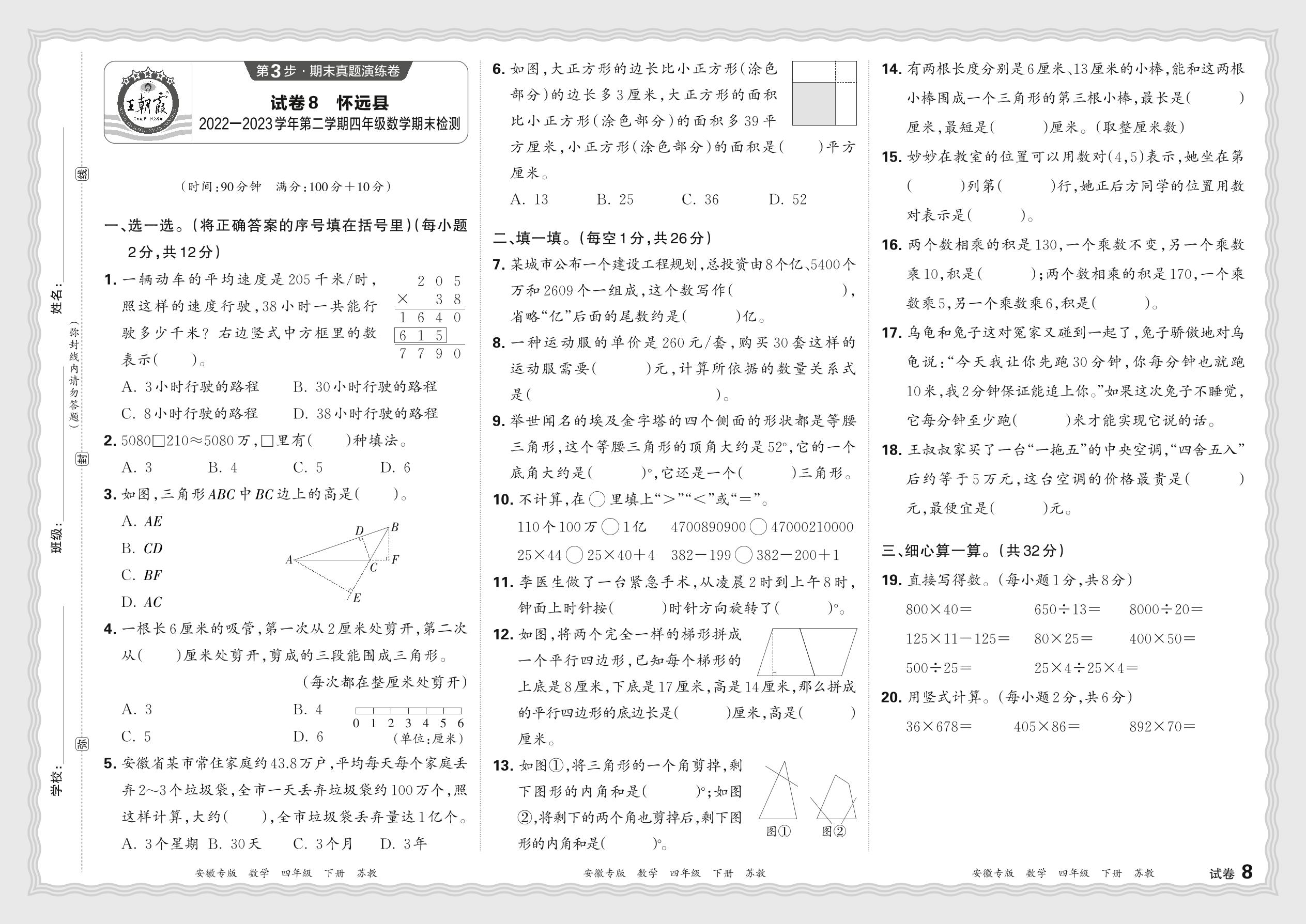 安徽省蚌埠市怀远县2022—2023学年第二学期四年级数学期末检测(苏教版)【8】