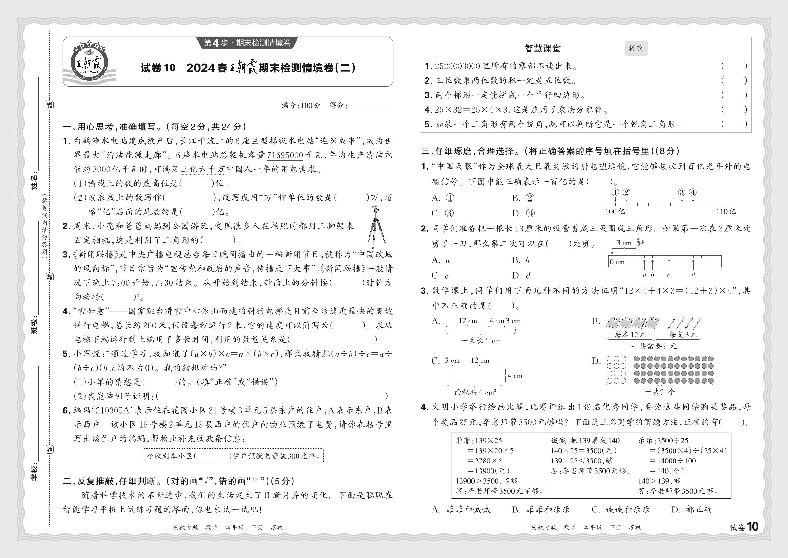 2024春下册四年级数学苏教版 王朝霞期末检测情境卷(二)