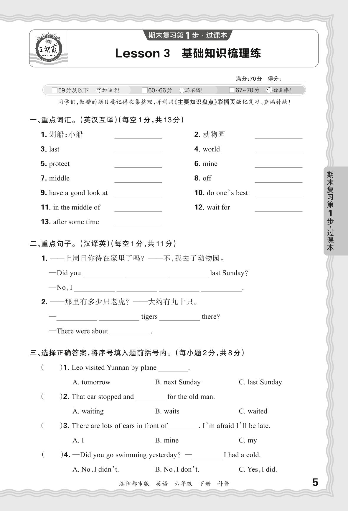 2024春下册六年级英语科普版 期末过课本洛阳版·Lesson 3 基础知识梳理练