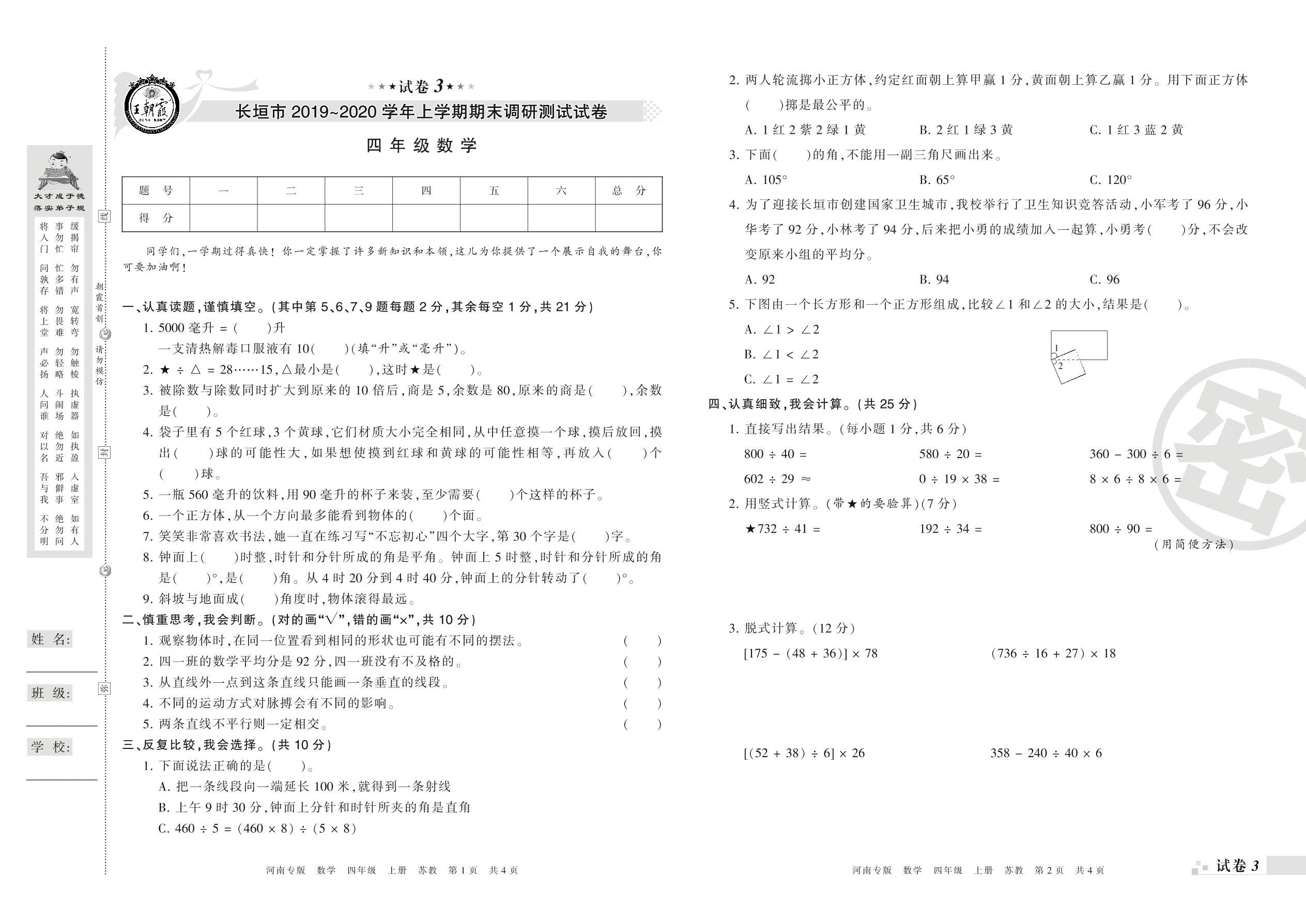 2019-2020学年第一学期长垣市四年级数学试卷(苏教版)【3】