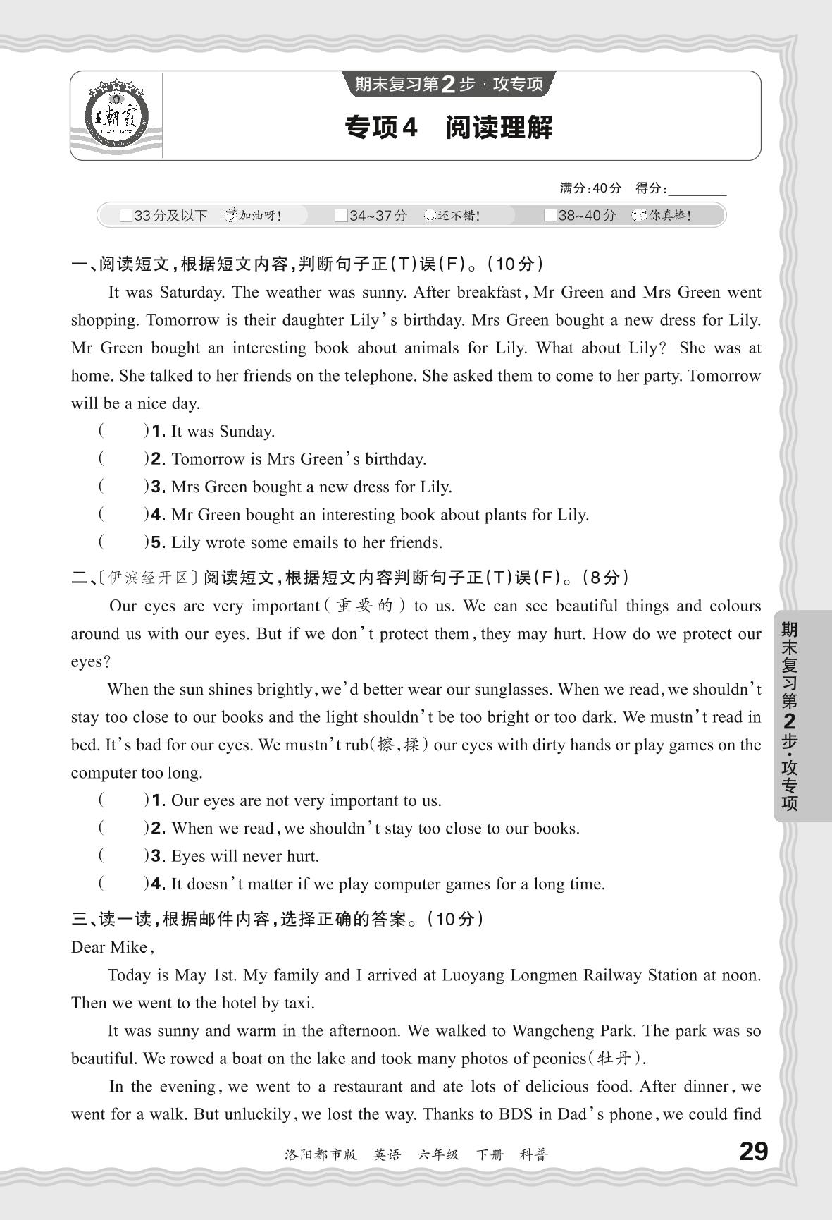 2024春下册六年级英语科普版 期末专项卷洛阳版·阅读理解【4】