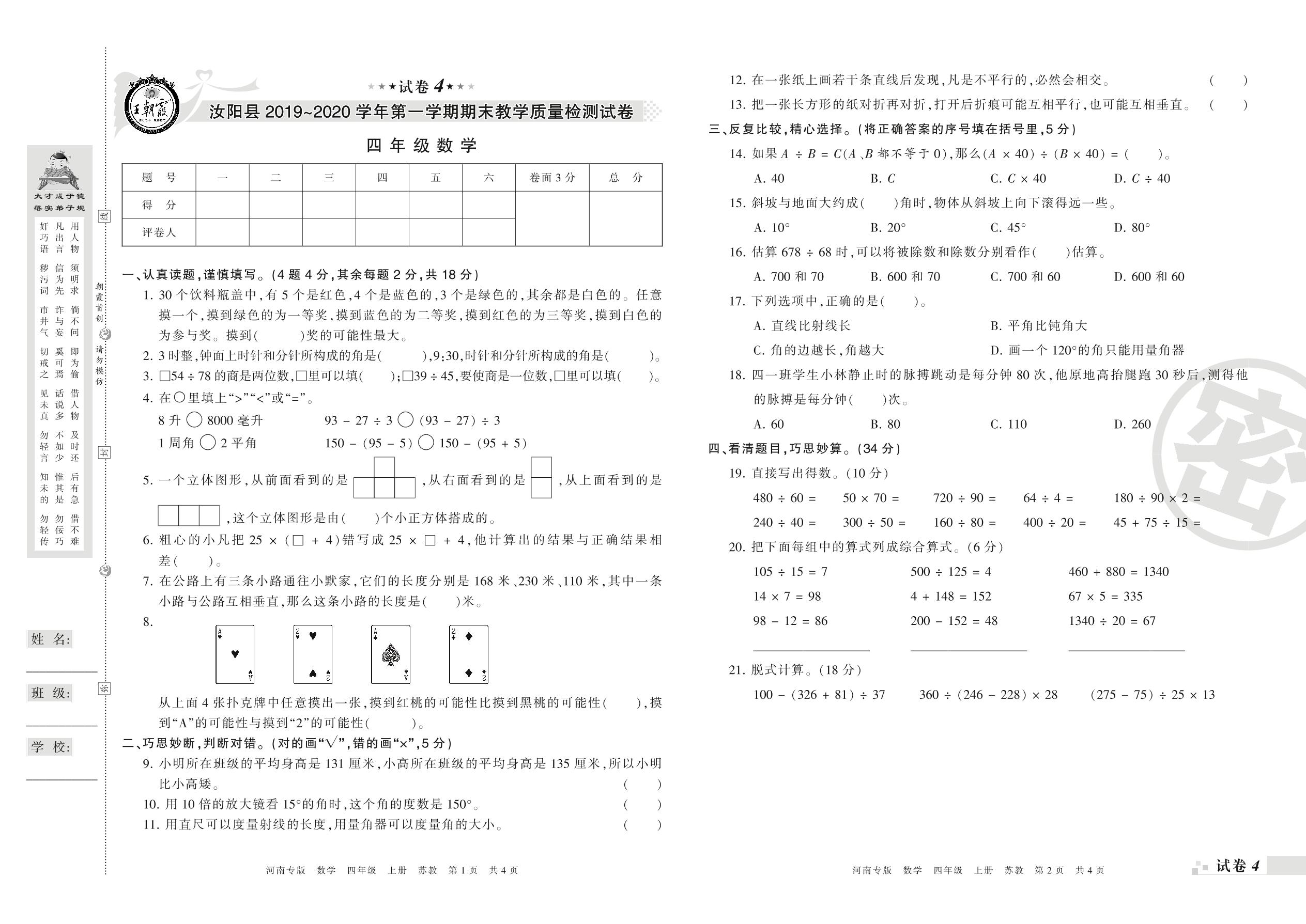 2019-2020学年第一学期洛阳市汝阳县四年级数学试卷(苏教版)【4】