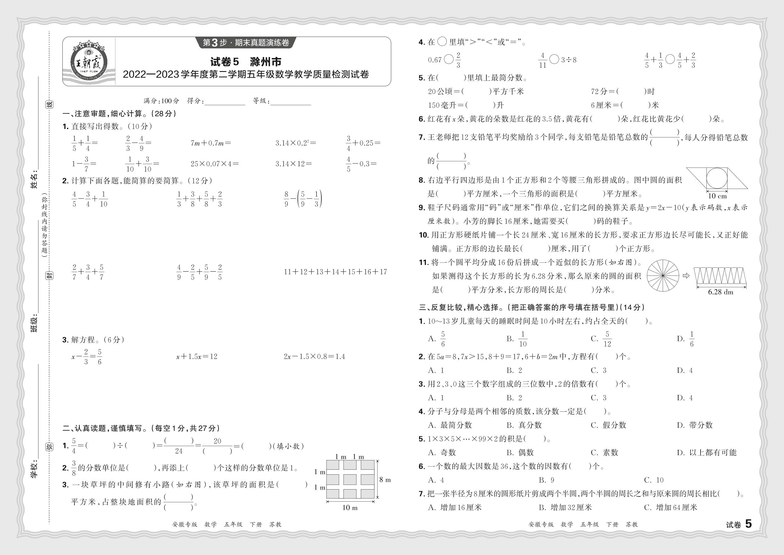 安徽省滁州市2022-2023学年度第二学期五年级数学教学质量检测试卷(苏教版)【5】