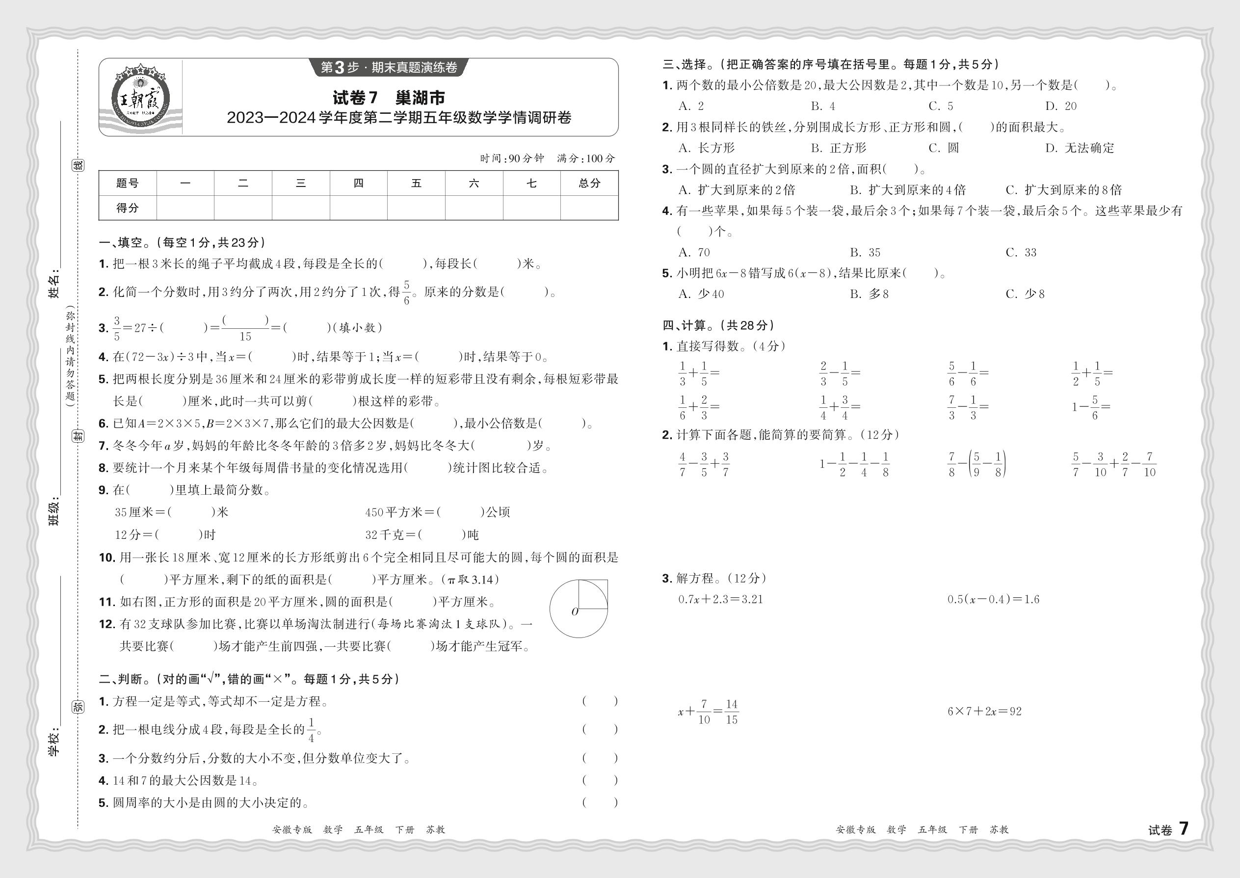 安徽省合肥市巢湖市2023—2024学年度第二学期五年级数学学情调研卷(苏教版)【7】
