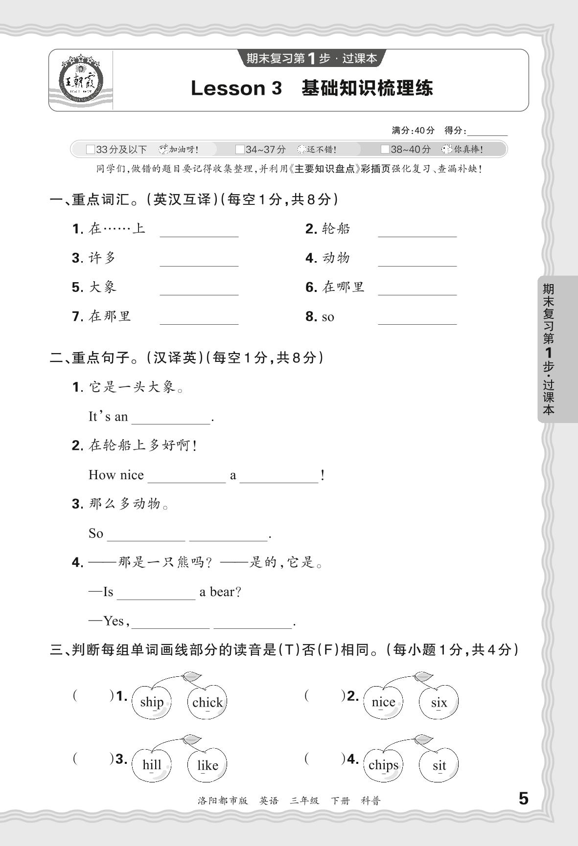 2024春下册三年级英语科普版 期末过课本洛阳版·Lesson 3 基础知识梳理练