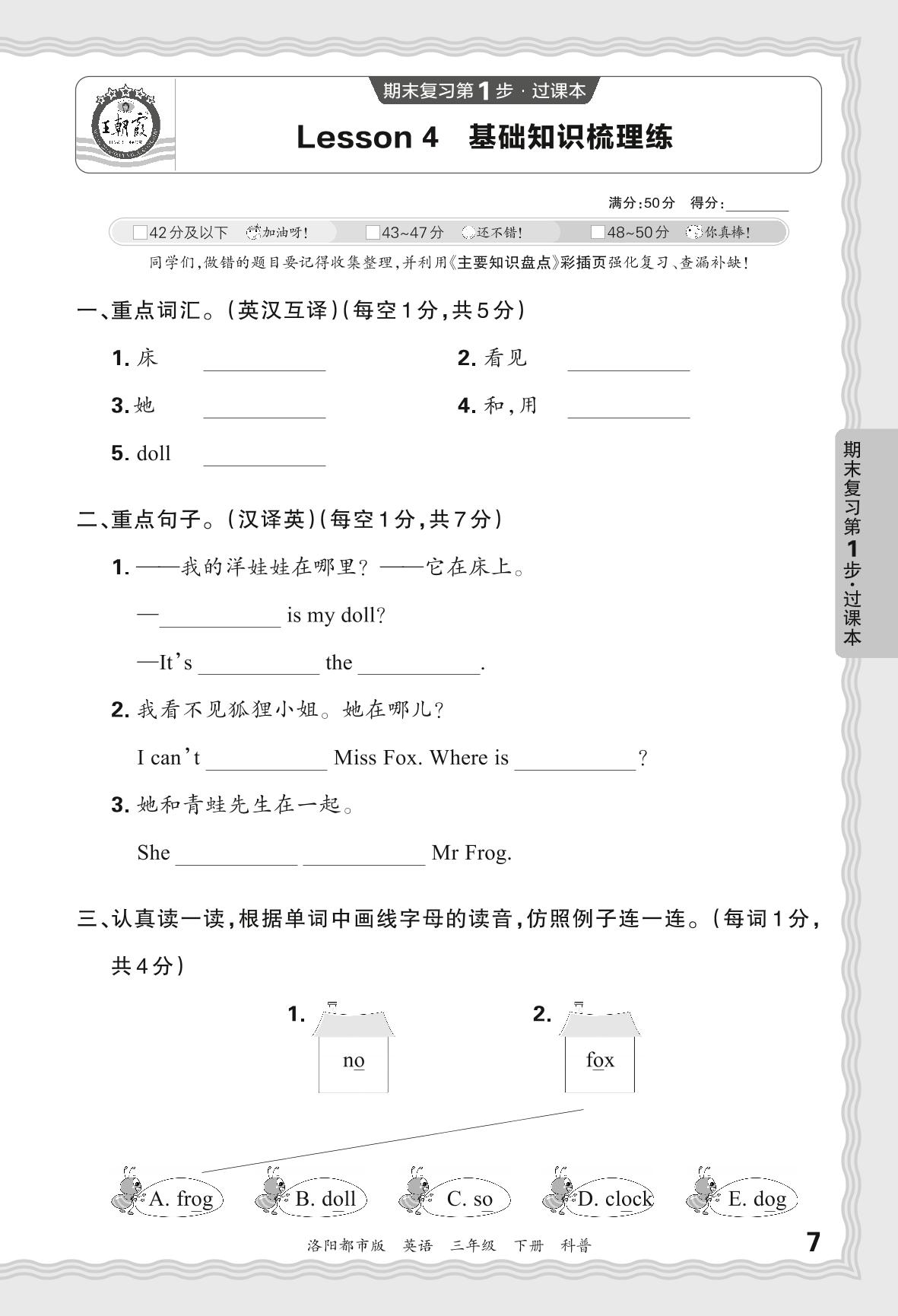 2024春下册三年级英语科普版 期末过课本洛阳版·Lesson 4 基础知识梳理练