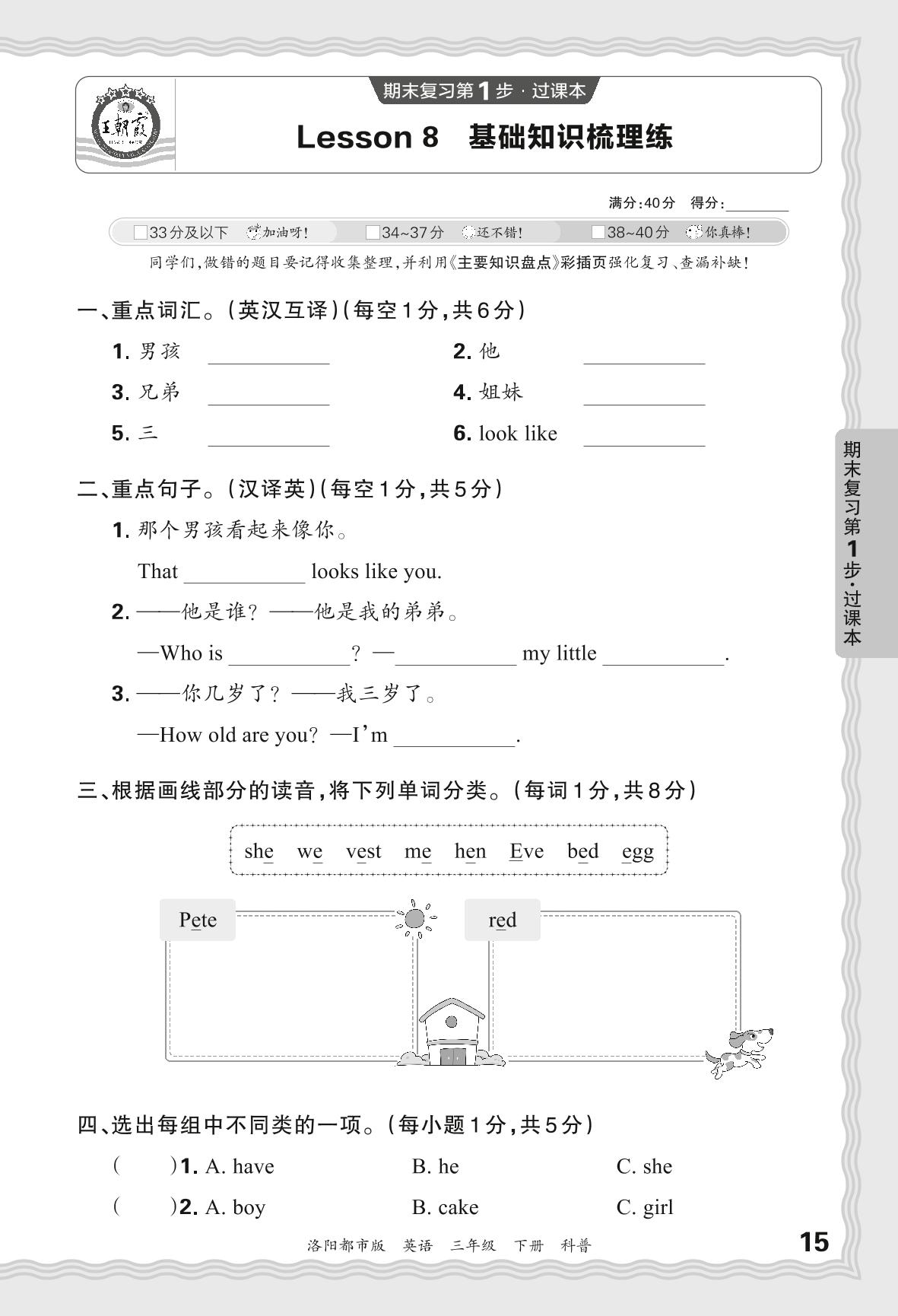 2024春下册三年级英语科普版 期末过课本洛阳版·Lesson 8 基础知识梳理练