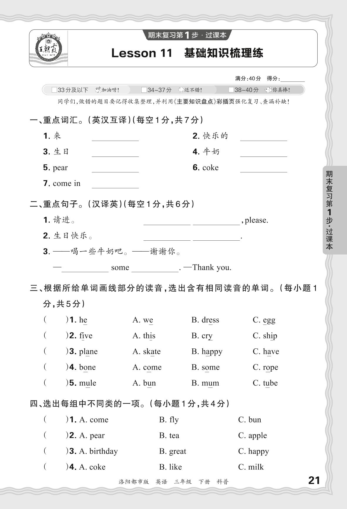 2024春下册三年级英语科普版 期末过课本洛阳版·Lesson 11 基础知识梳理练