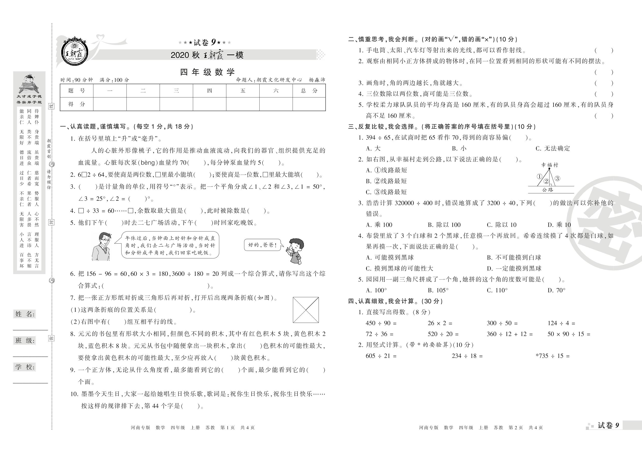 王朝霞期末模拟卷四年级上册数学(苏教版)_R210804140342【9】