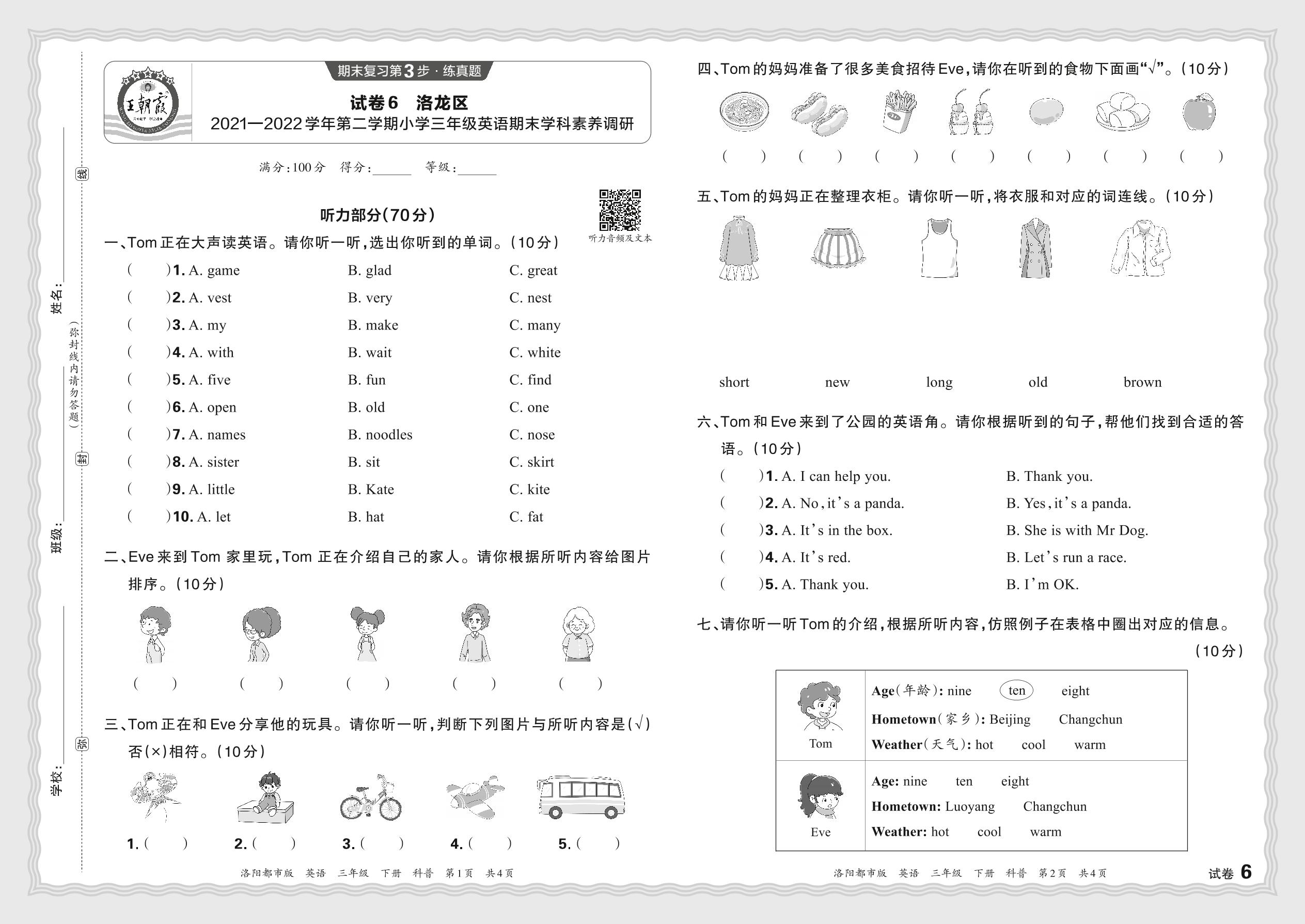 河南省洛阳市洛龙区2021—2022学年第二学期小学三年级英语期末学科素养调研(科普版)【6】
